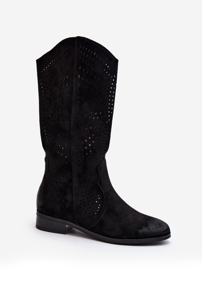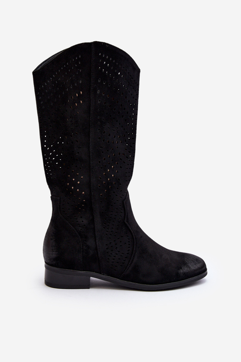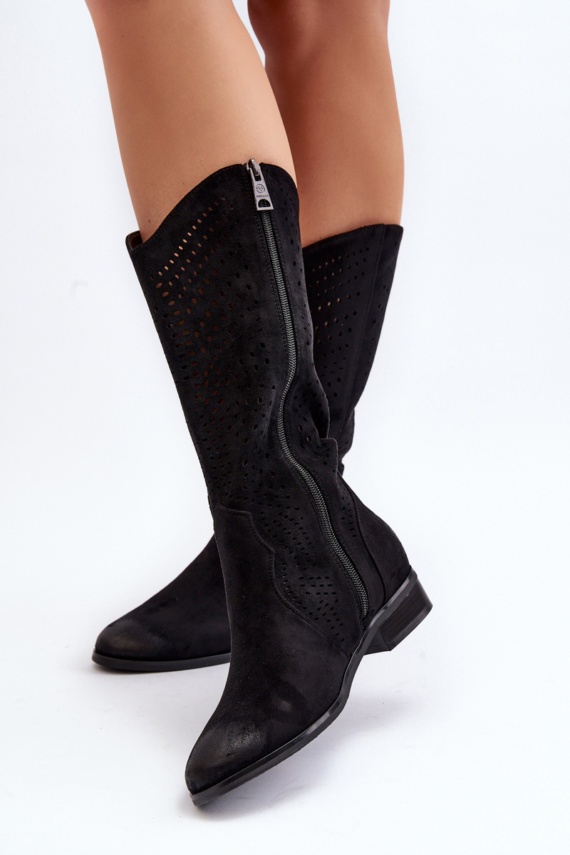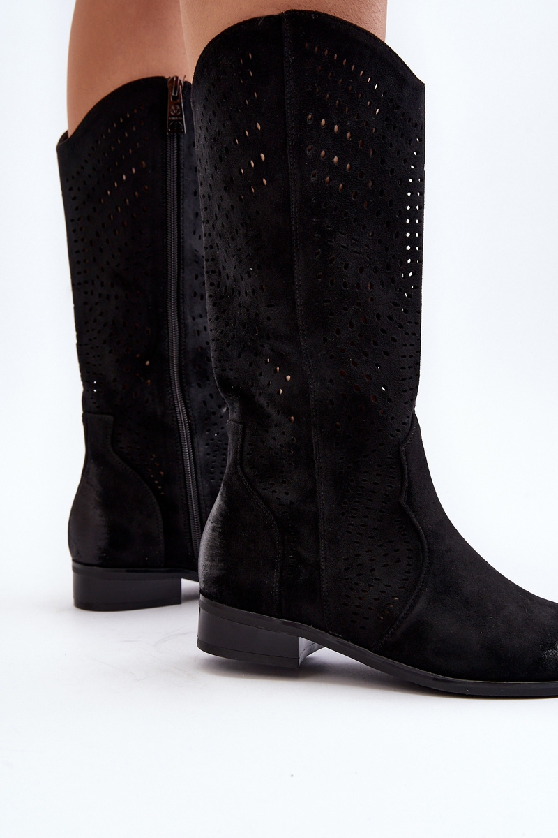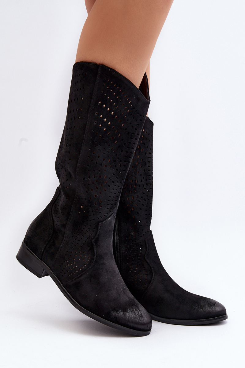 Kozaki damskie z ażurową cholewką idealnie dopełnią wiosenne stylizacje. Wykonane z eko zamszu. Osadzone na płaskim, stabilnym obcasie. Noski zaokrąglone. Model ten zapinany jest na zamek. Wkładka wykonana ze skóry naturalnej. Koniecznie musisz je mieć! Przy wyborze rozmiaru prosimy sugerować się tabelą rozmiarów.