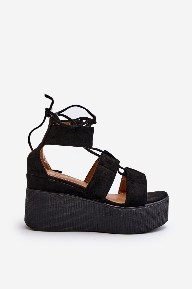 Sandały damskie osadzone na grubej platformie oraz koturnie. Wykonane z eko zamszu. Model ten posiada modne wiązanie wokół kostki. Lekko profilowana wkładka z eko skóry zapewni wygodę podczas użytkowania. Fason ten dopasujesz do wielu stylizacji z letnimi sukienkami, spódnicami oraz spodniami! Przy wyborze rozmiaru prosimy sugerować się tabelą rozmiarów.