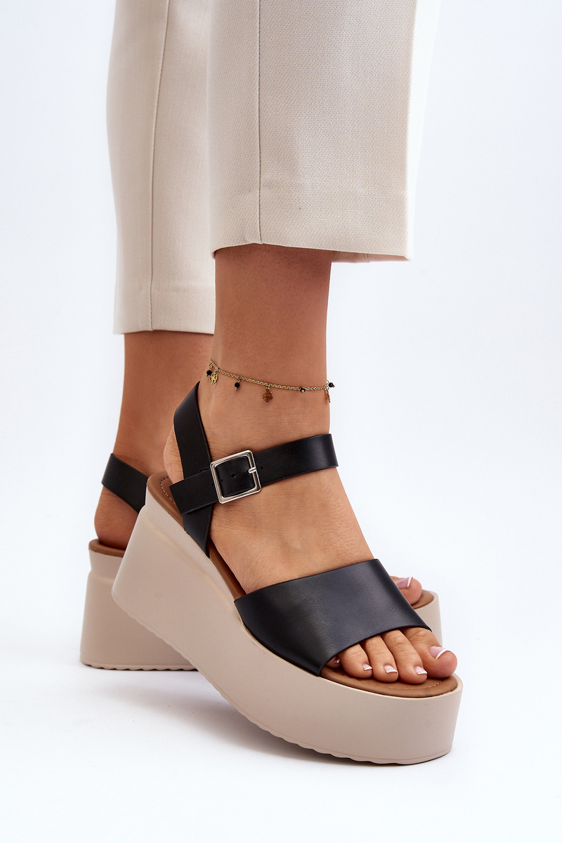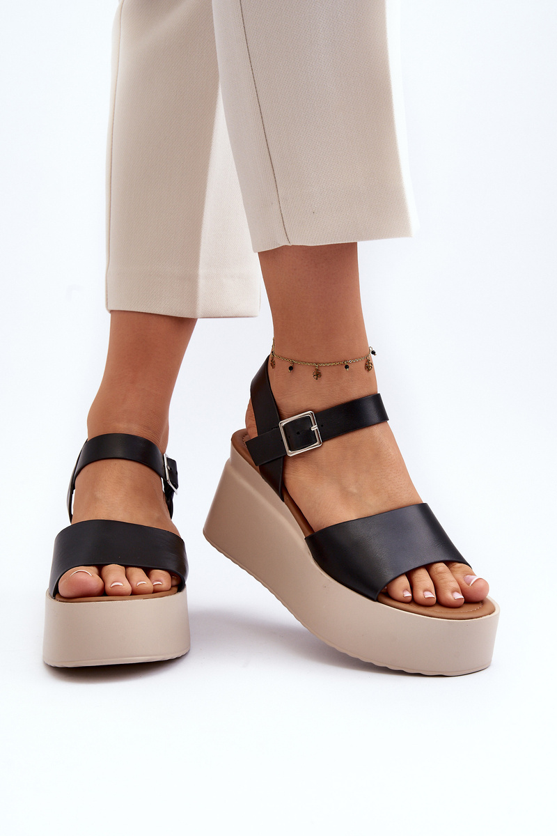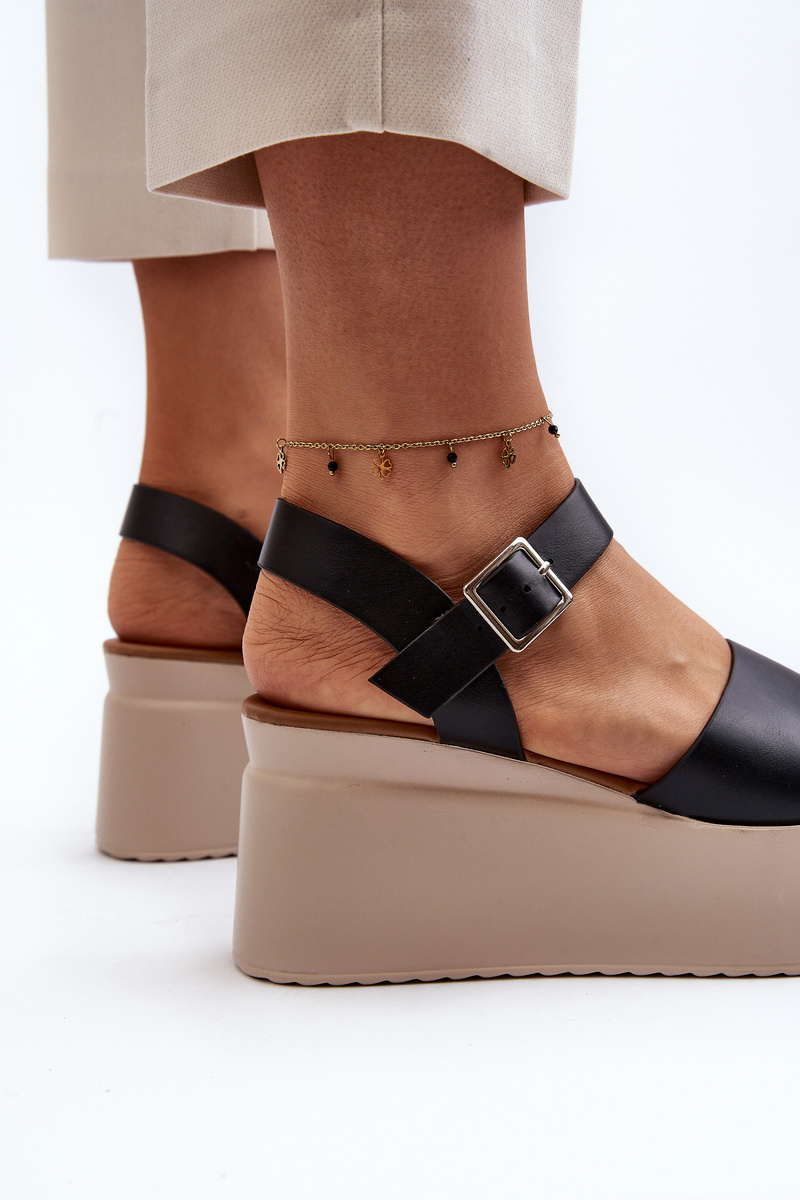 Sandały damskie wykonane z eko skóry. Osadzone na koturnie i platformie, co nie tylko dodaje im modnego wyglądu, ale także zapewnia stabilność podczas chodzenia. Zapinane na regulowany pasek ze sprzączką, łatwo dopasujesz je do swojej stopy. Przy wyborze rozmiaru prosimy sugerować się tabelą rozmiarów. Model ten będzie idealny na letnie spacery czy spotkania na świeżym powietrzu!