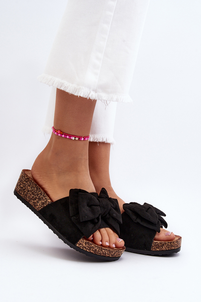 Klapki damskie na korkowej platformie. Buty posiadają lekko profilowaną wkładkę, która zagwarantuje komfort podczas użytkowania. Cholewka wykonana z przyjemnego w dotyku eko zamszu. Urocza kokarda na przodzie. Model ten idealnie sprawdzi się na co dzień, do pracy czy na zakupy. Idealne na upalne dni! Koniecznie powinnaś je mieć! Przy wyborze rozmiaru prosimy sugerować się tabelą rozmiarów.