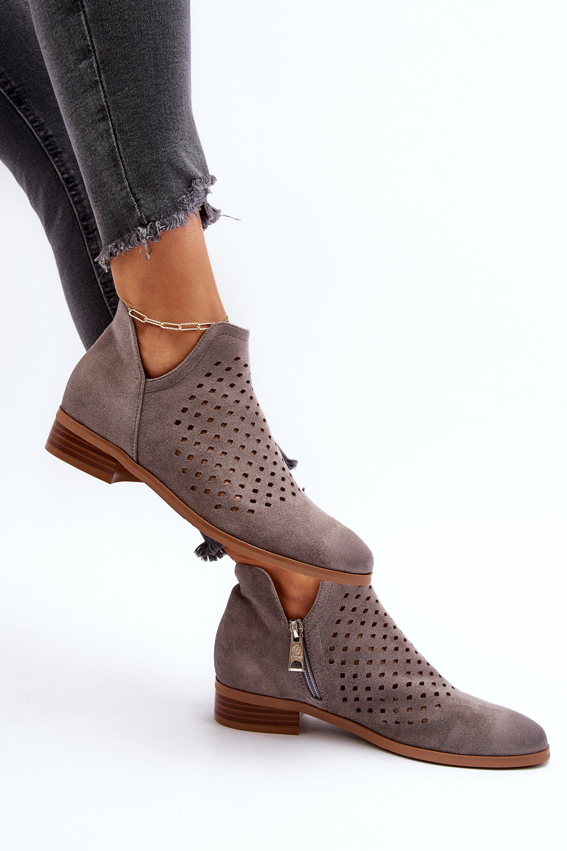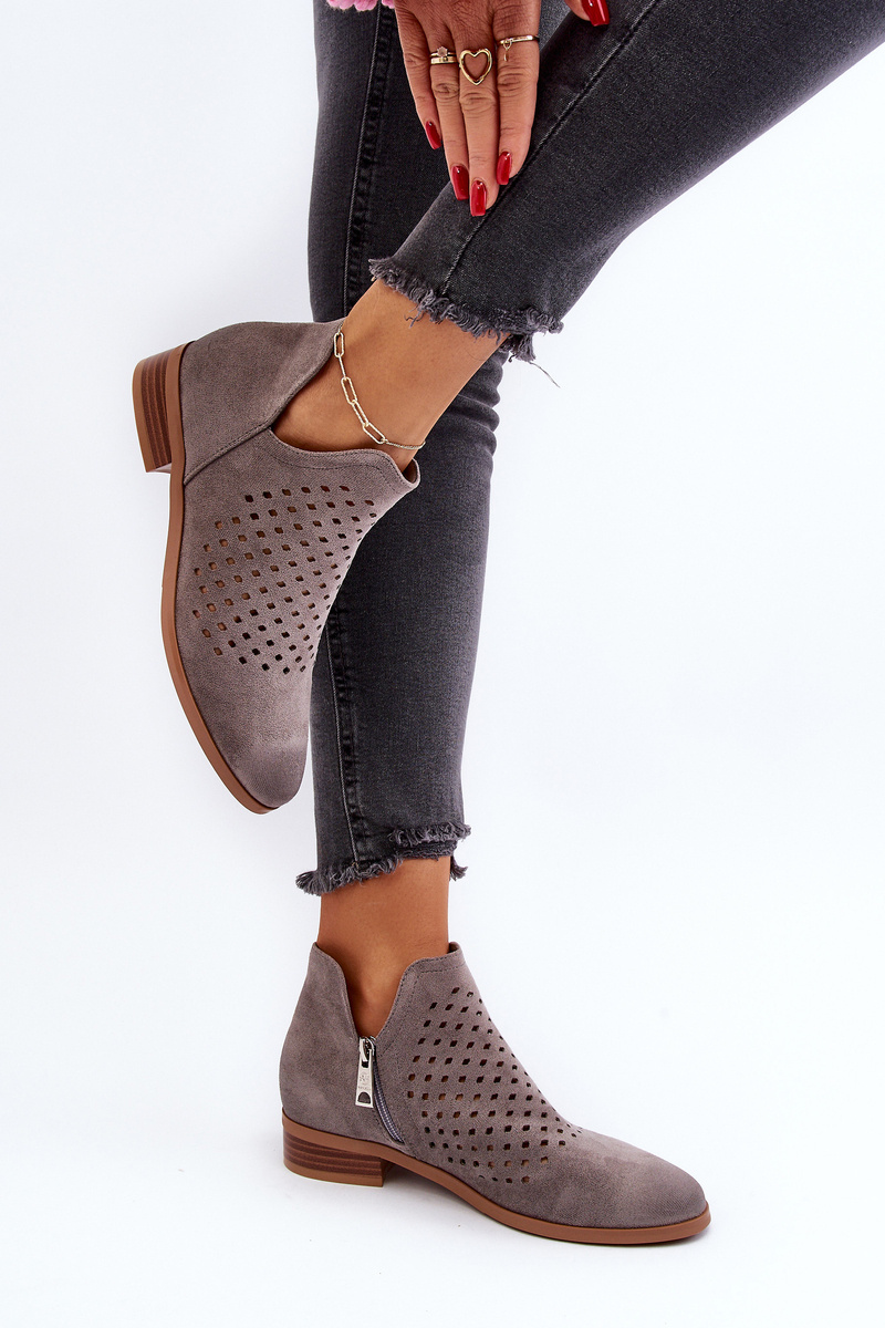 Ażurowe botki wykonane z eko zamszu są nie tylko modne, ale także bardzo funkcjonalne. Idealnie komponują się z różnorodnymi kobiecymi stylizacjami, dodając im subtelny, elegancki akcent. Płaski obcas zapewnia stabilność i wygodę podczas użytkowania. Wkładka ze skóry naturalnej gwarantuje wysoki komfort noszenia nawet przez długie godziny. Noski zaokrąglone. Model ten to must-have w Twojej garderobie na nadchodzące miesiące! Przy wyborze rozmiaru prosimy sugerować się tabelą rozmiarów.
