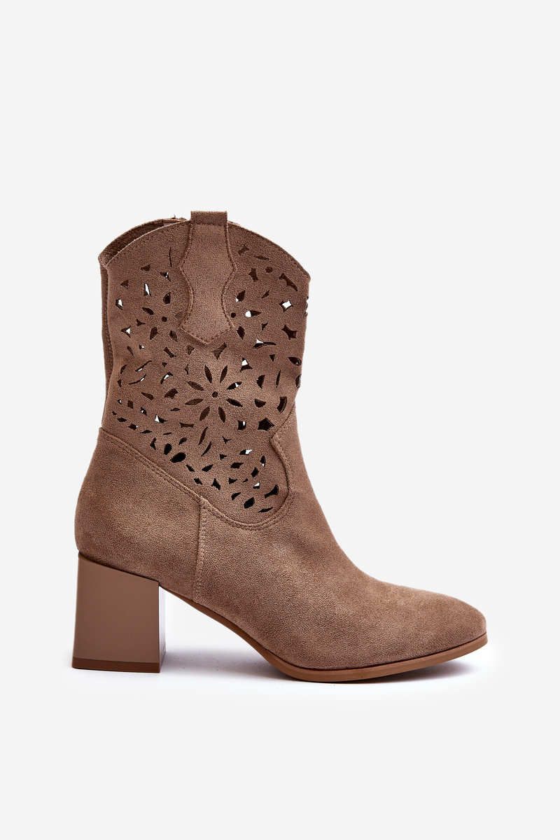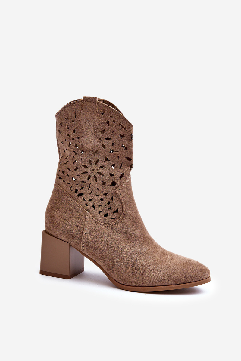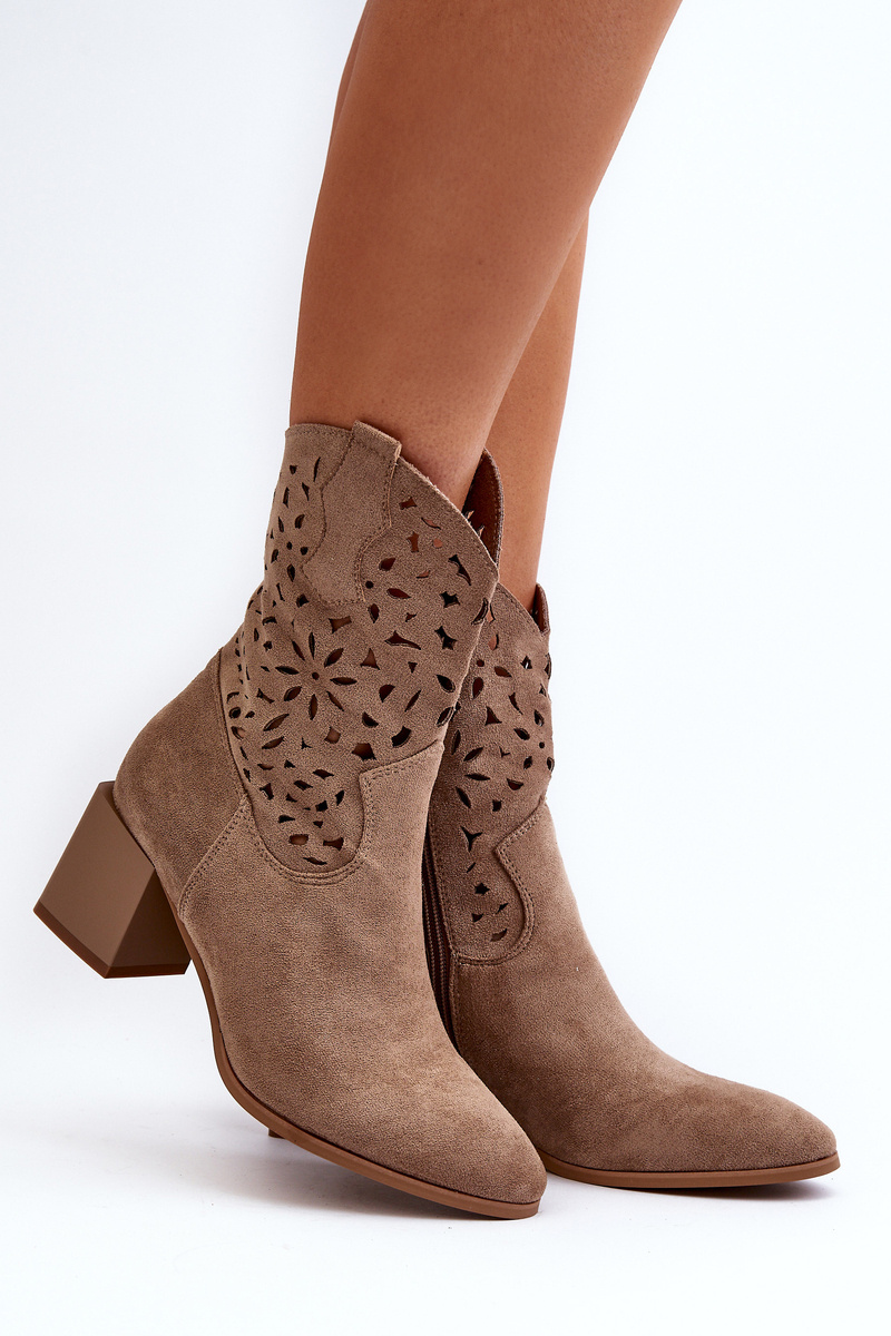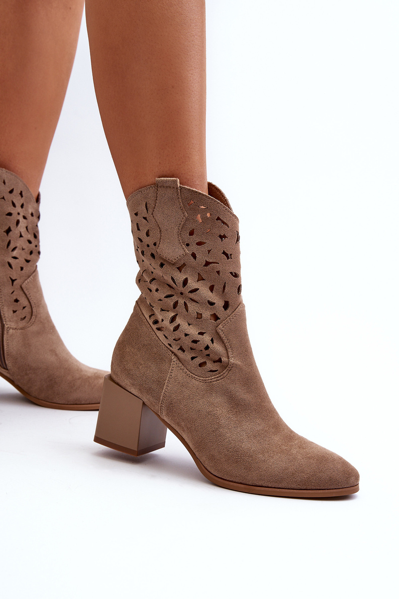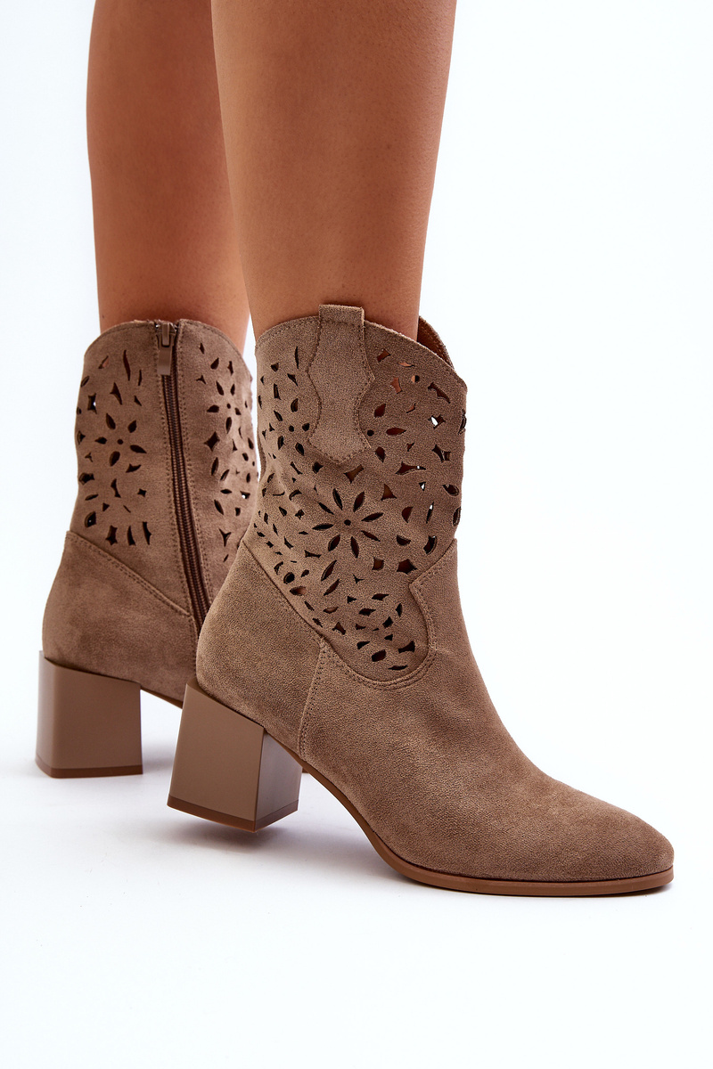 Zamszowe Botki Z Ażurową Cholewką Na Klocku Ciemnobeżowe Irvelame