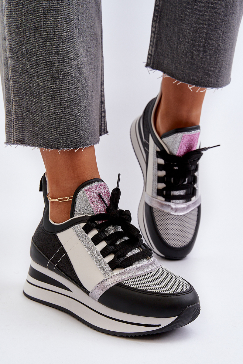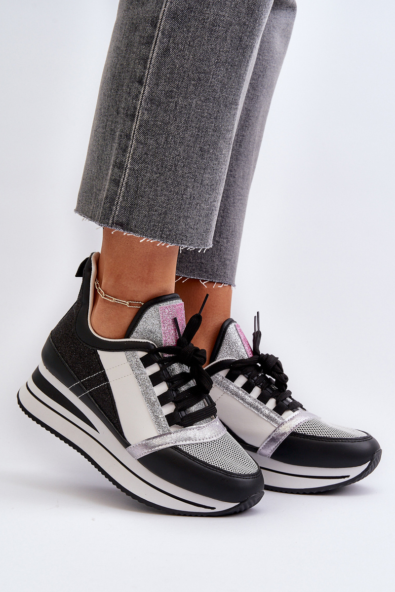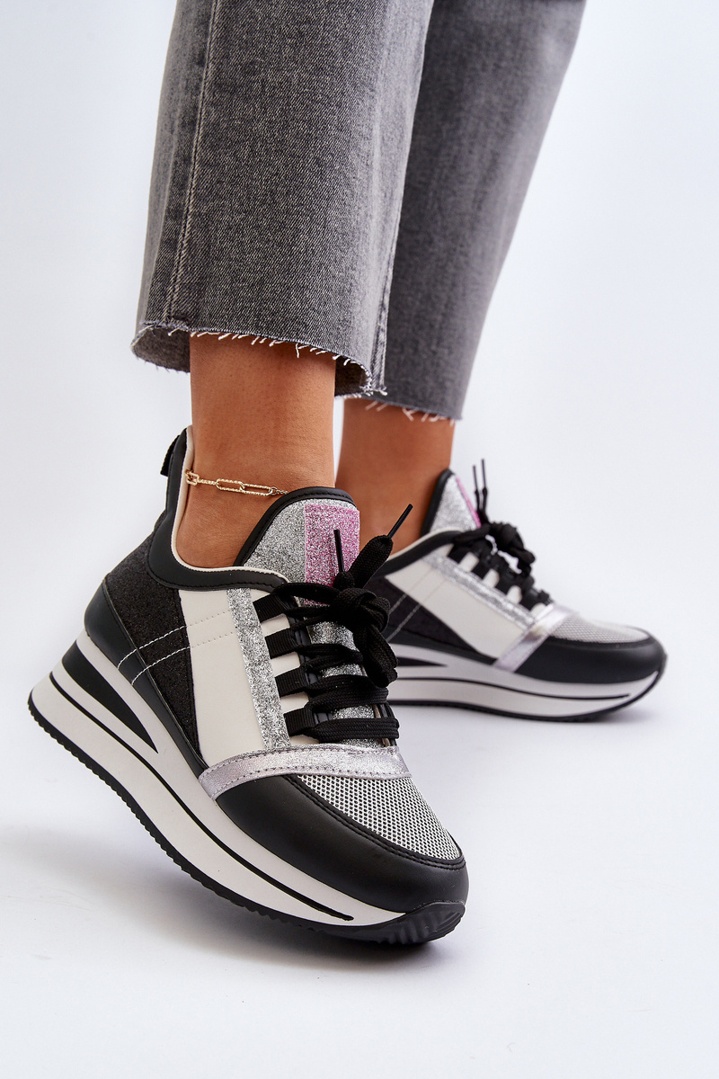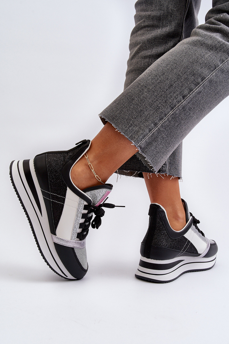 Damskie Sneakersy Na Koturnie I Platformie Z Brokatem Czarne Rafani