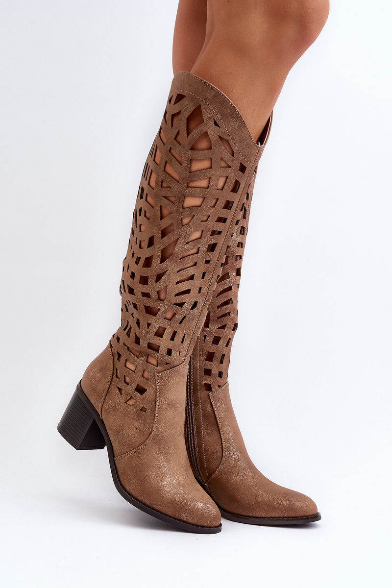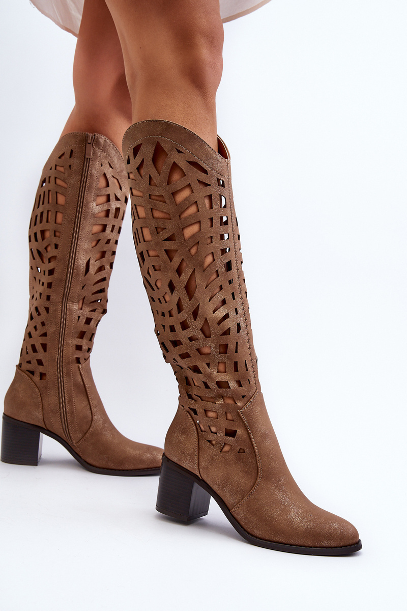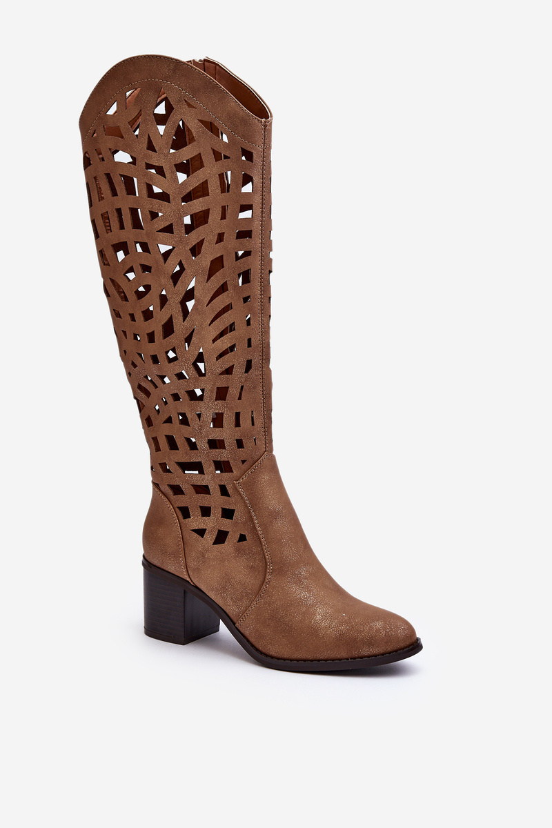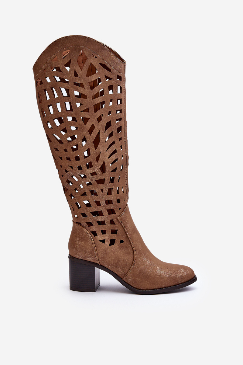 Ażurowe Kozaki Na Obcasie Brązowe Pinkema