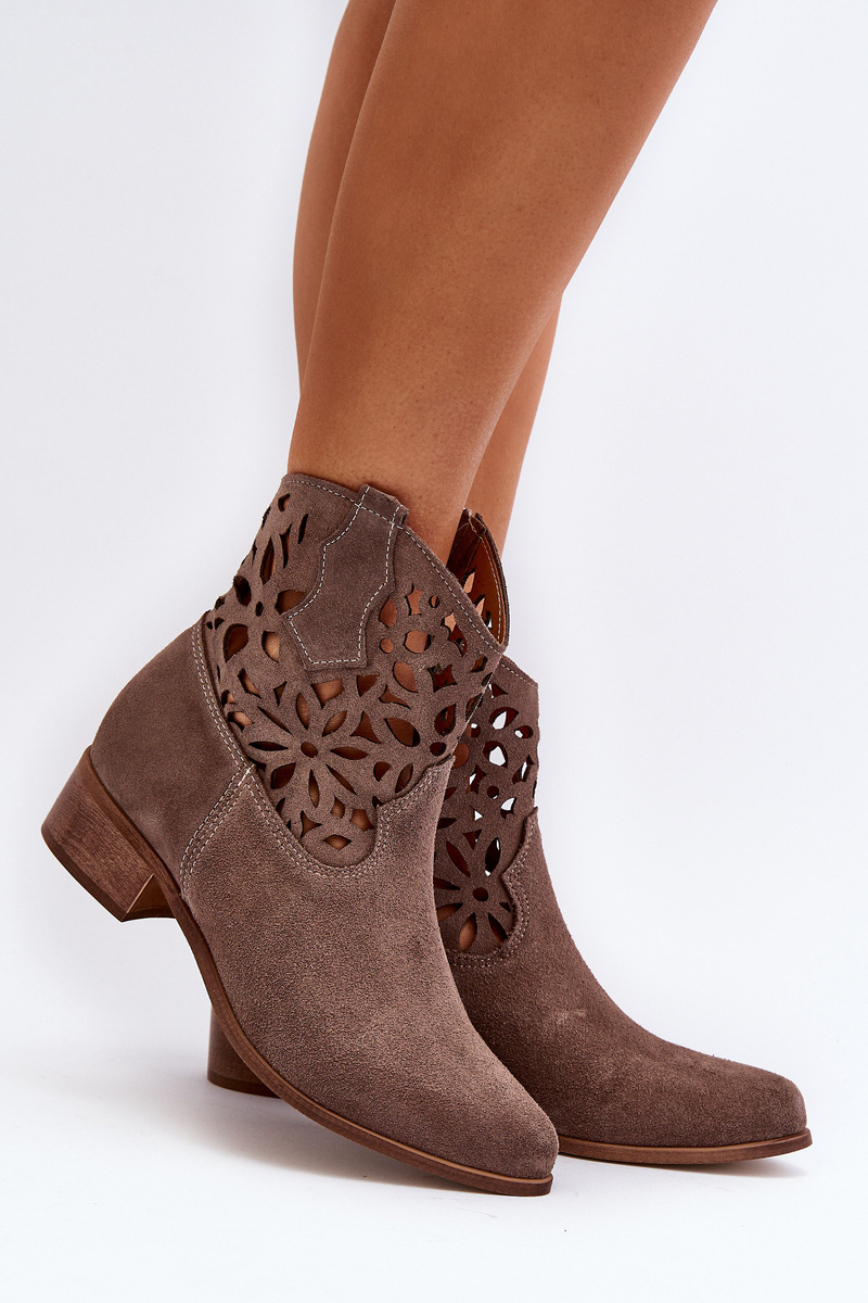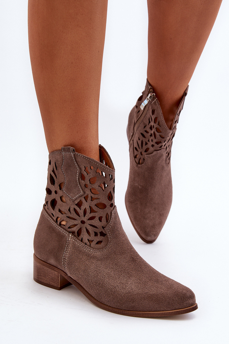 Zazoo 3404 Ażurowe Botki Kowbojki Na Niskim Obcasie Zamszowe Brązowe