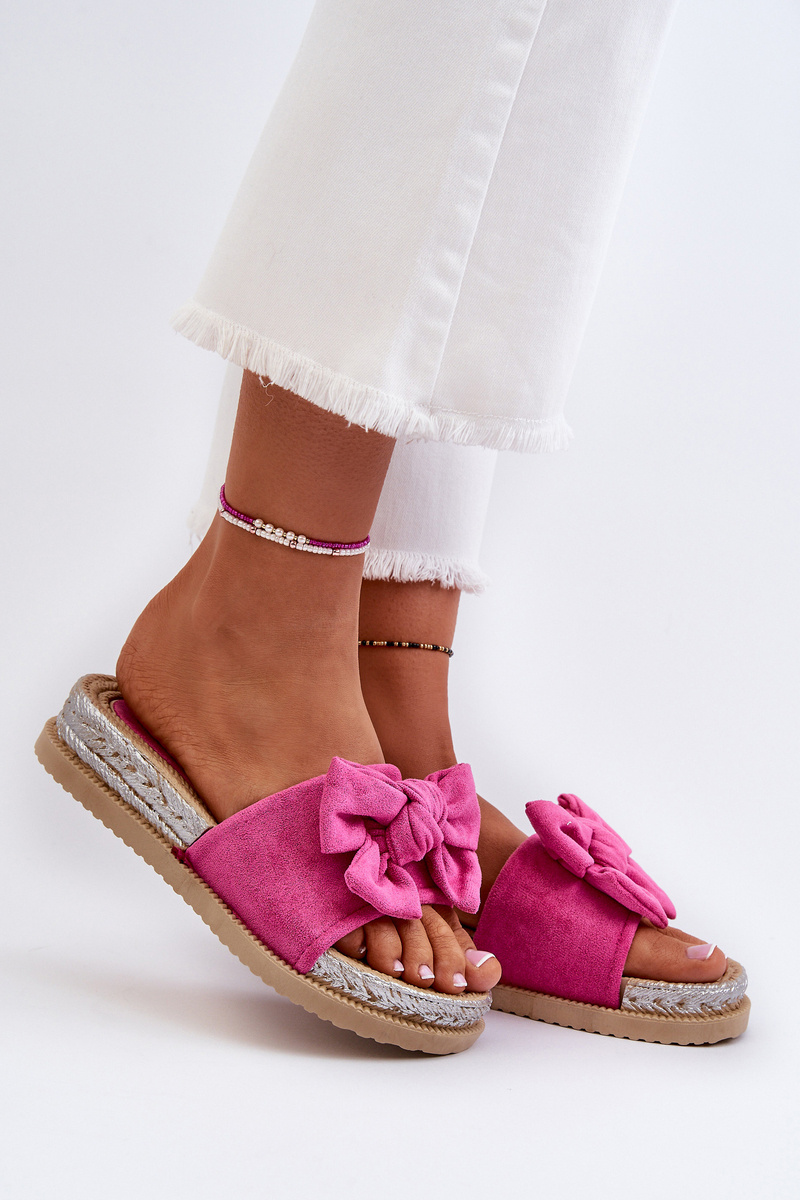 Klapki damskie wykonane z przyjemnego w dotyku eko zamszu. Kokarda dodaje im subtelności i dziewczęcego uroku. Doskonałe na letnie spacery, spotkania ze znajomymi czy wieczorne wyjścia. Dopasuj je do swojej ulubionej letniej stylizacji! Przy wyborze rozmiaru prosimy sugerować się tabelą rozmiarów.