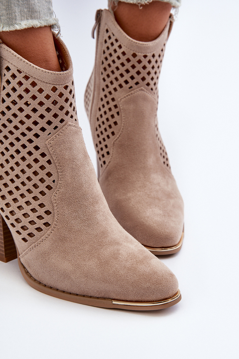 Ażurowe Botki Damskie Eko Zamszowe Na Słupku Beżowe Stardara