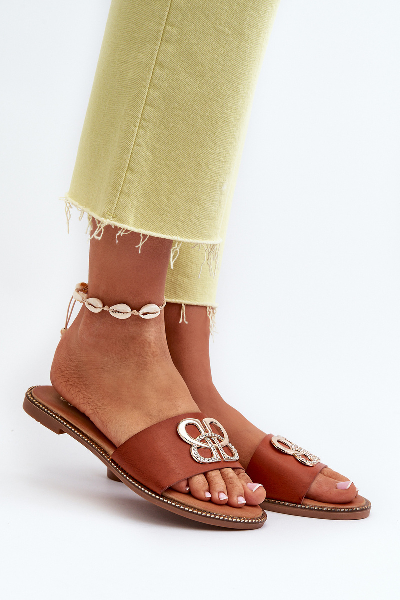 Klapki Damskie Z Ozdobą Eko Skórzane Na Płaskim Obcasie Brązowe Sadria