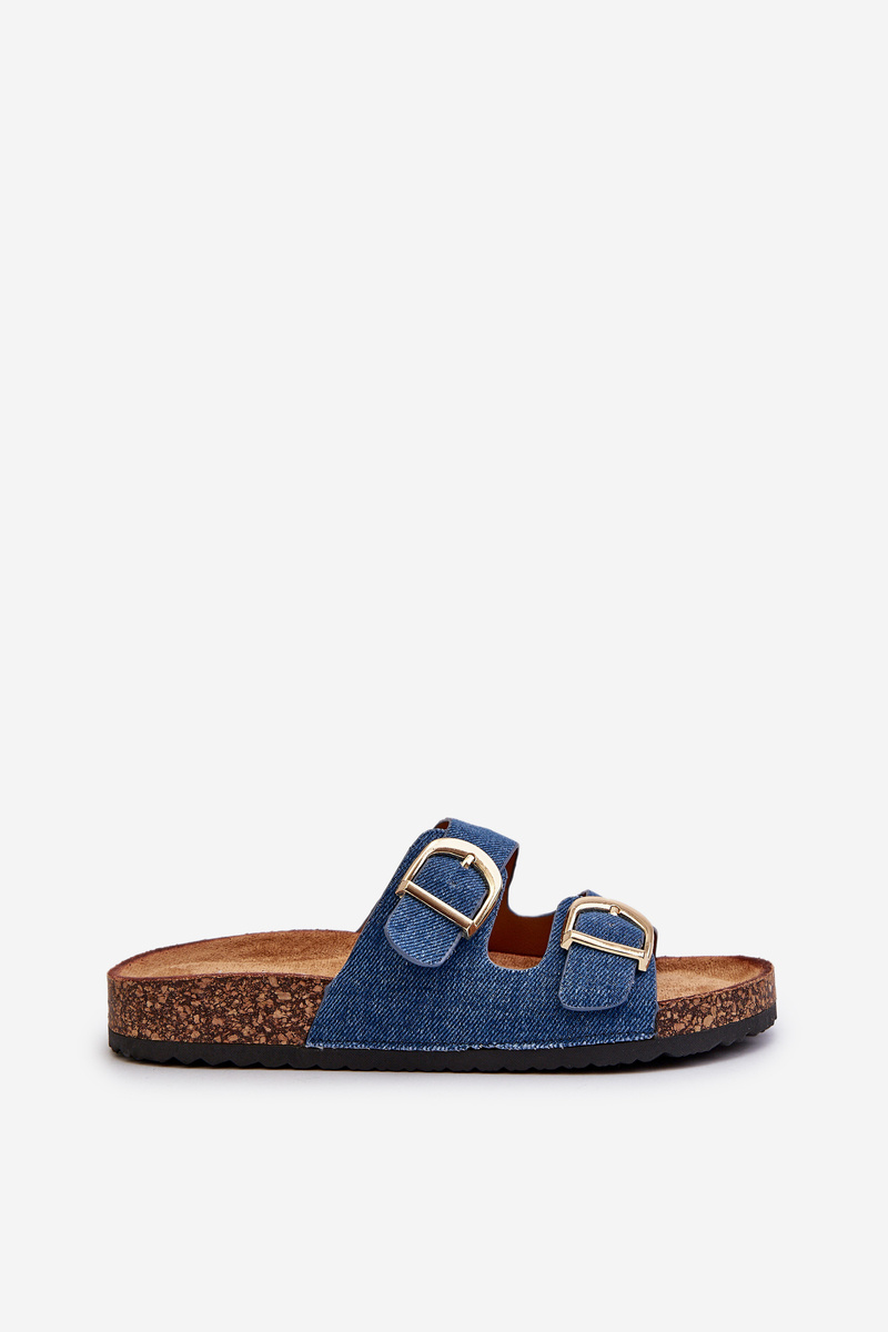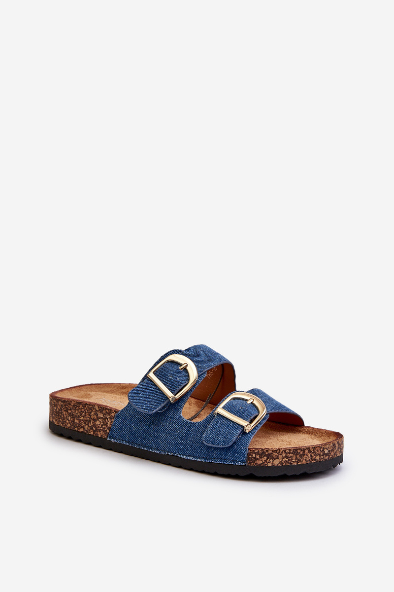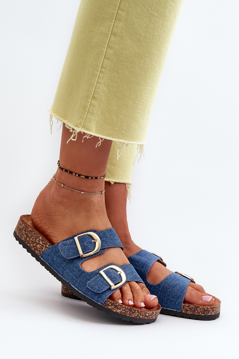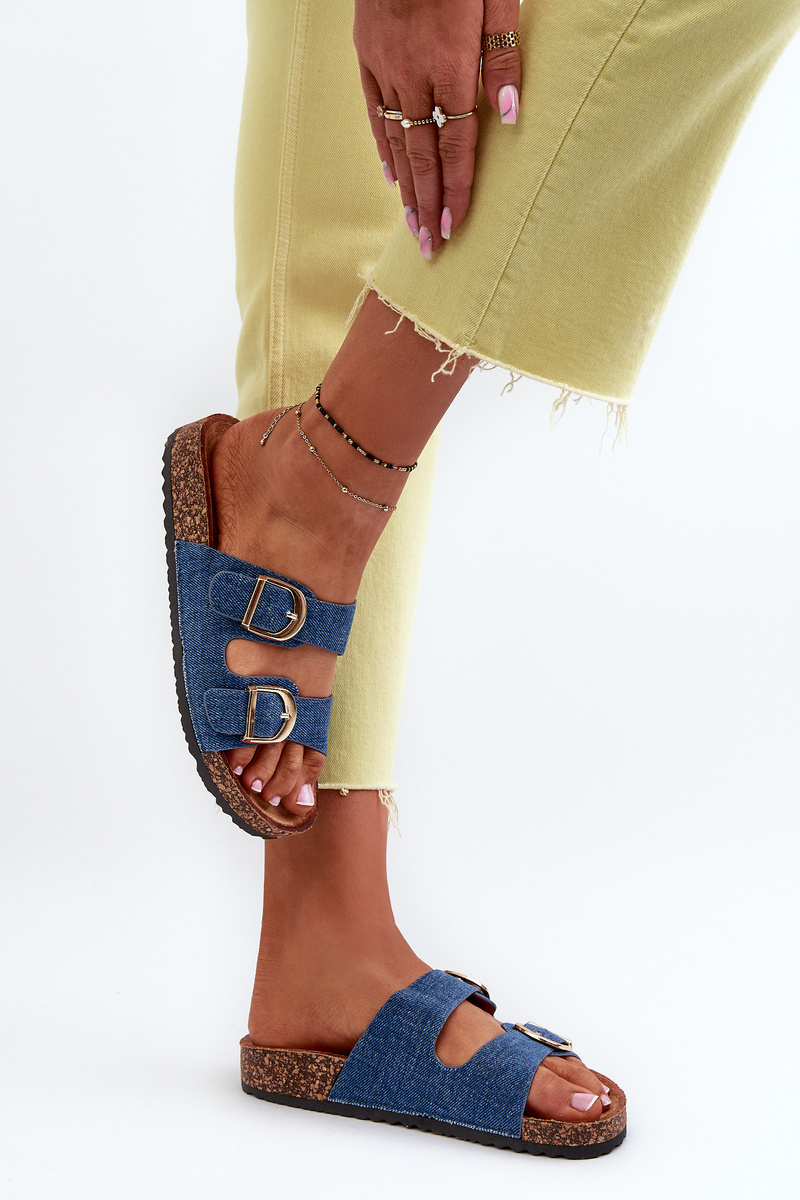 Jeansowe Damskie Klapki Na Korkowej Platformie Z Paskami Ciemnoniebieskie Doretta