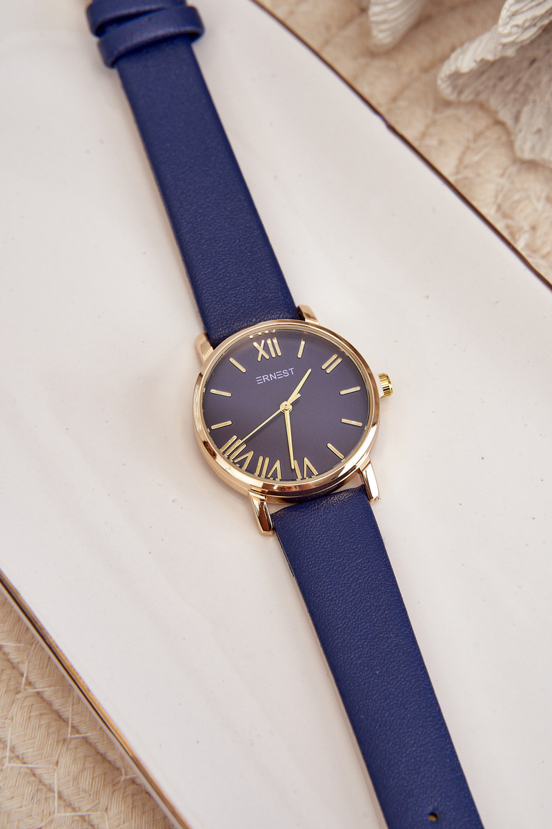 Zegarek damski marki Ernest. Pasek wykonany z eko skóry. Prosta, lecz wyjątkowa forma tego zegarka czyni go idealnym dodatkiem zarówno do codziennych, jak i bardziej formalnych okazji. Dzięki swojej uniwersalności i elegancji zawsze będzie stanowił subtelne dopełnienie każdego stroju.