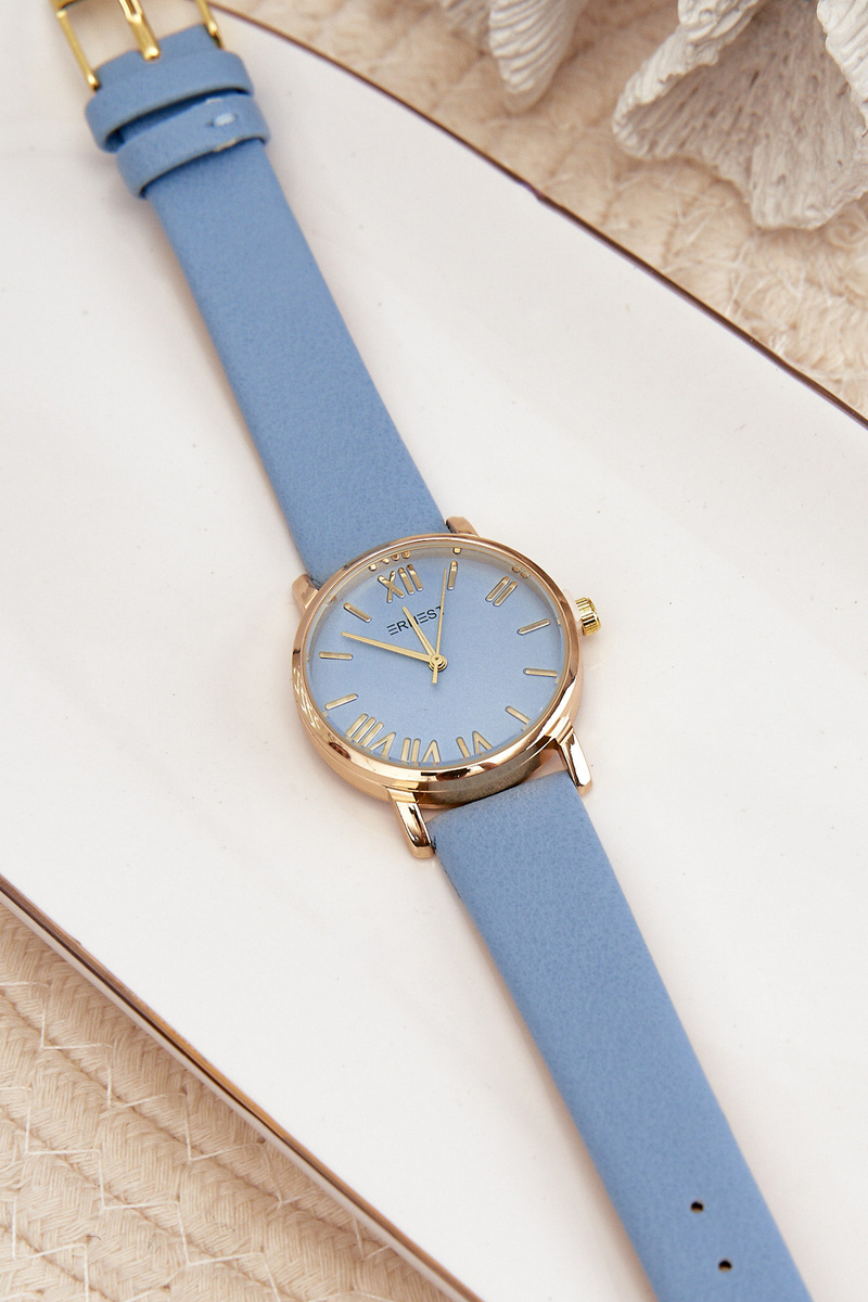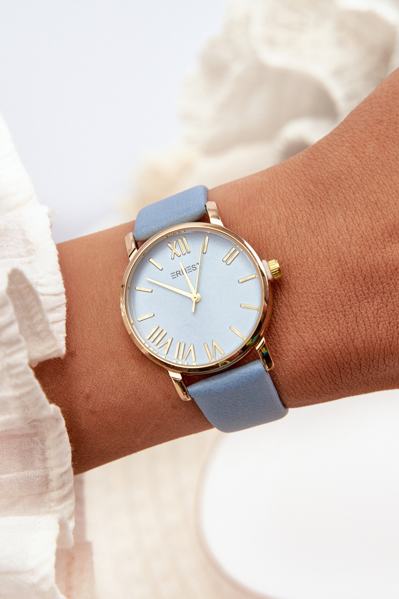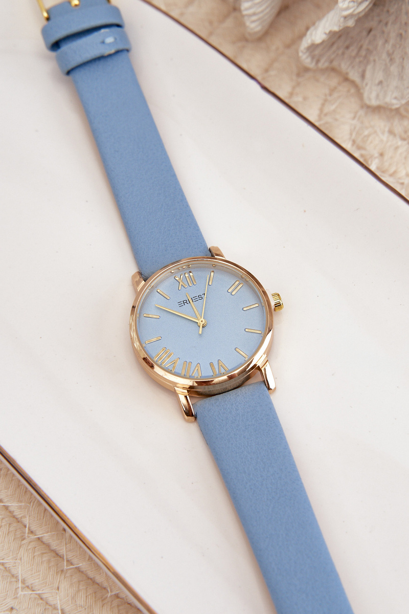 Zegarek damski marki Ernest. Pasek wykonany z eko skóry. Prosta, lecz wyjątkowa forma tego zegarka czyni go idealnym dodatkiem zarówno do codziennych, jak i bardziej formalnych okazji. Dzięki swojej uniwersalności i elegancji zawsze będzie stanowił subtelne dopełnienie każdego stroju.