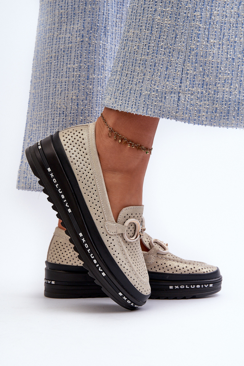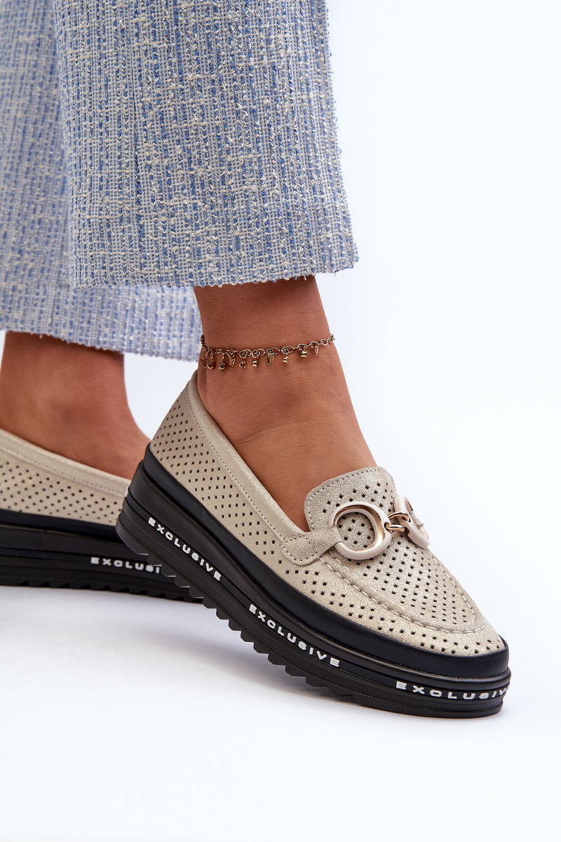 Skórzane Błyszczące Mokasyny Damskie Na Platformie Z Ozdobą S.Barski LR750 Złote