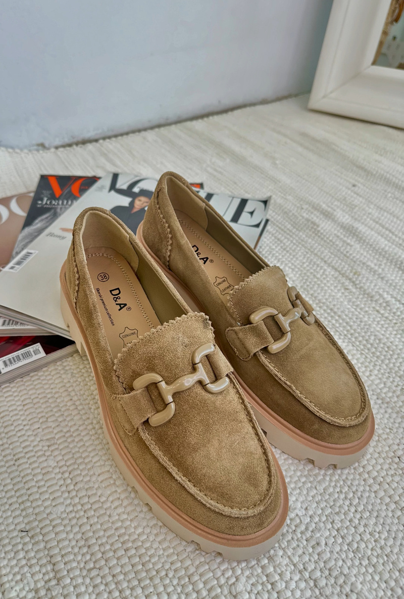 Mokasyny damskie wykonane z naturalnego zamszu. Osadzone na płaskim obcasie. Dodatkowy element ozdobny z przodu nadaje im wyjątkowego uroku, co sprawia, że stają się one oryginalnym dodatkiem do każdej stylizacji. Bez względu na to, czy wybierasz się na spotkanie ze znajomymi, czy na bardziej formalne wydarzenie, te mokasyny będą idealnym dopełnieniem Twojego looku, dodając mu nuty subtelnej elegancji. Przy wyborze rozmiaru prosimy sugerować się tabelą rozmiarów.