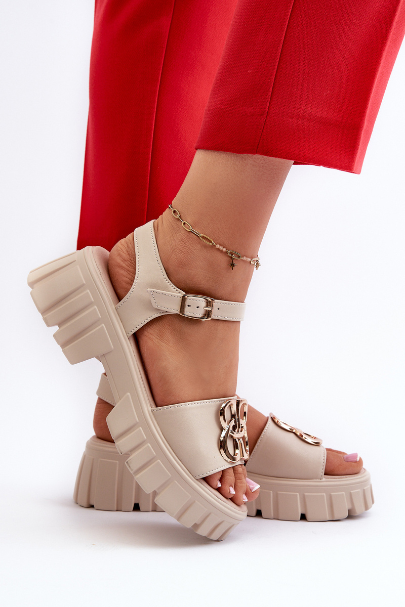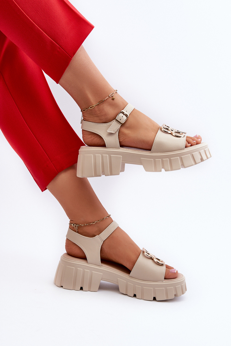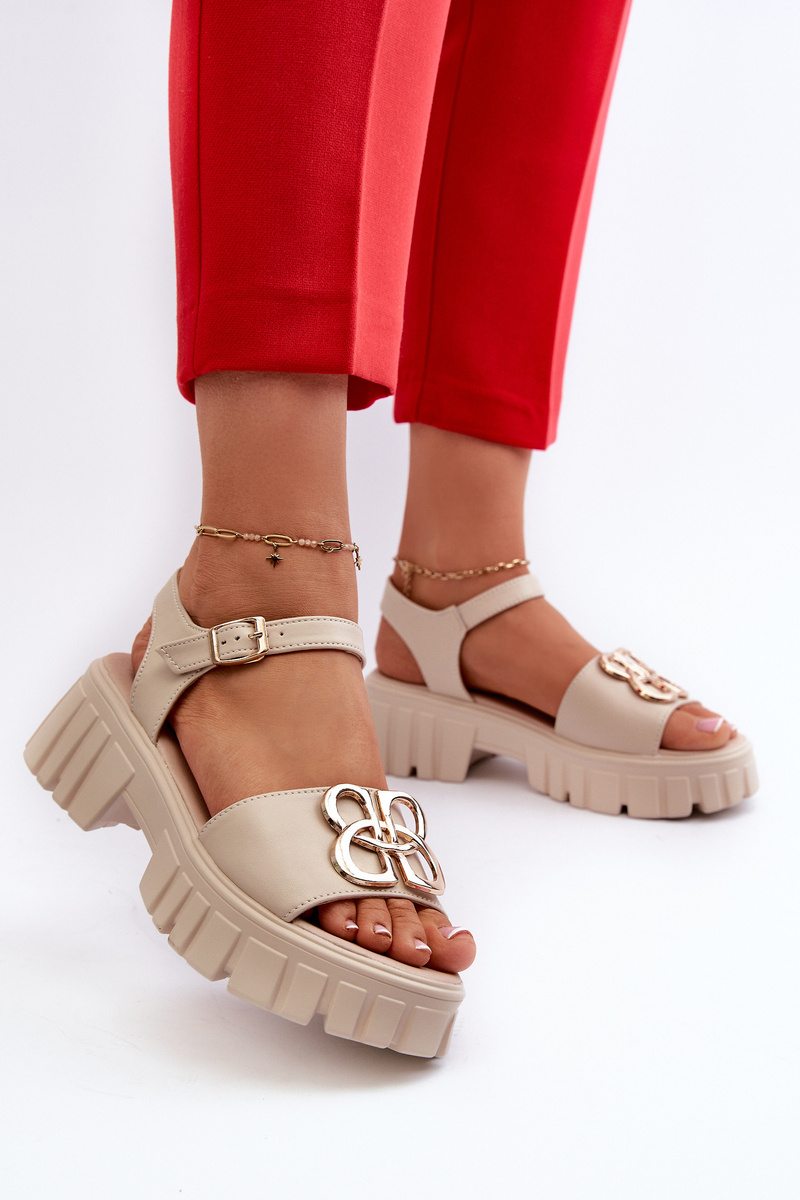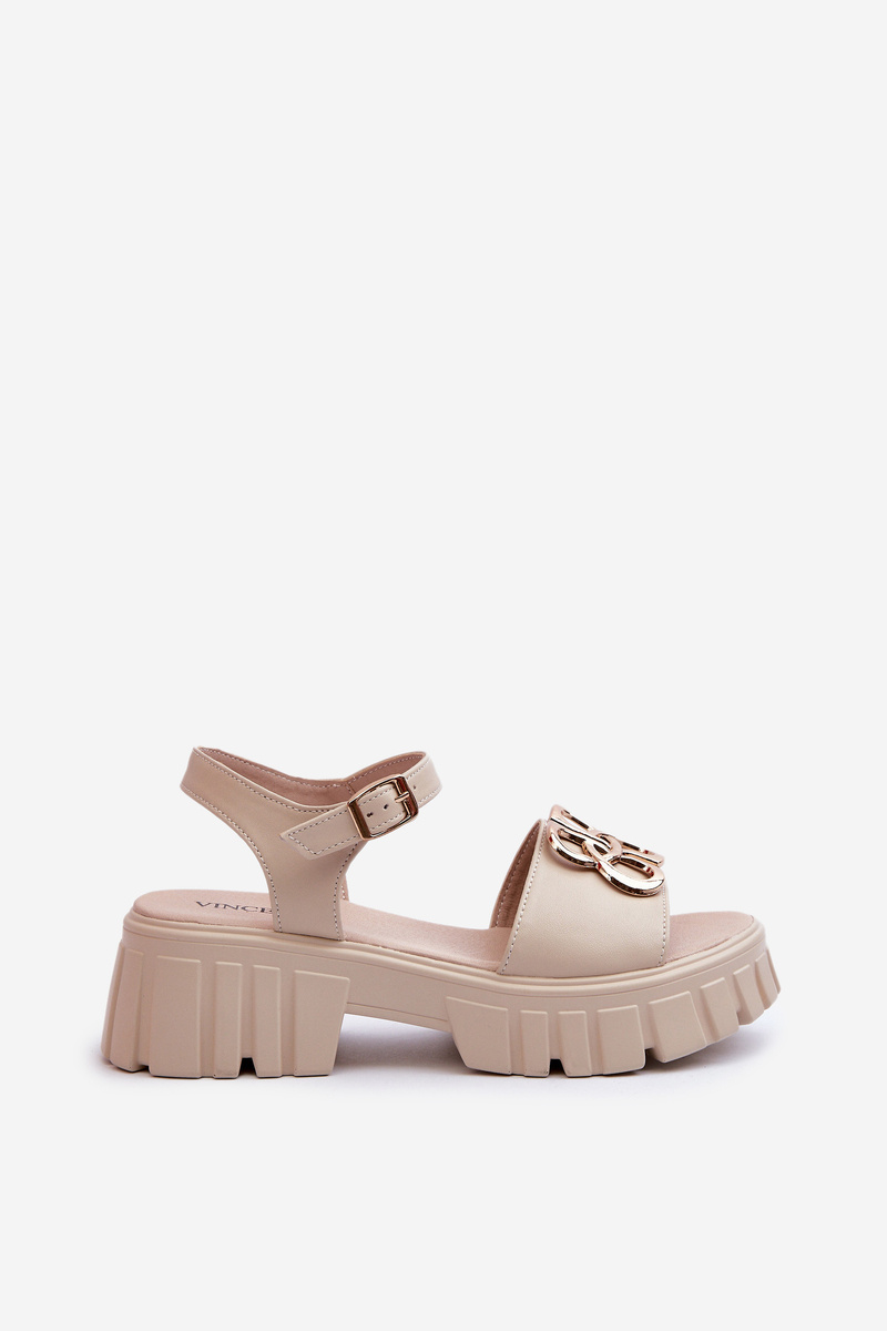 Skórzane Sandały Damskie Ze Złotą Ozdobą Beżowe Vinceza 7910