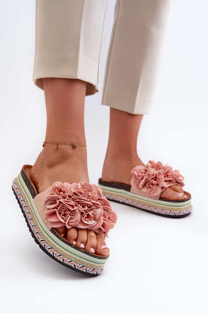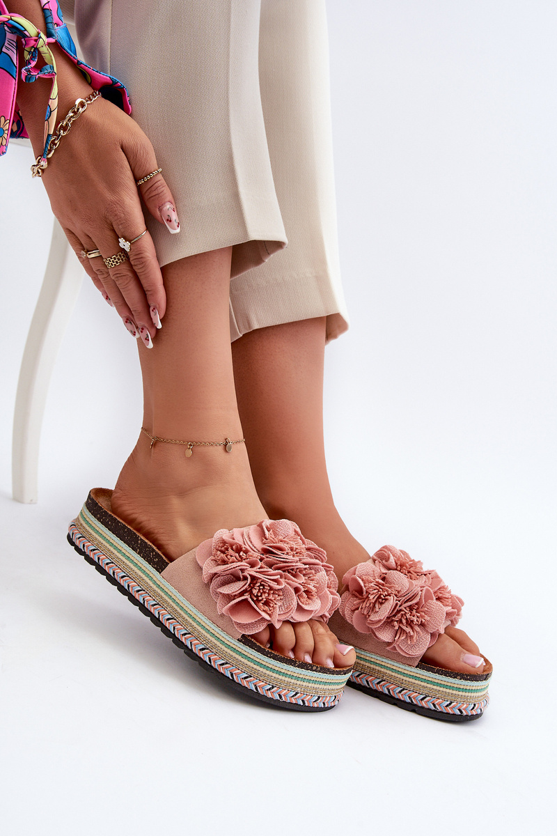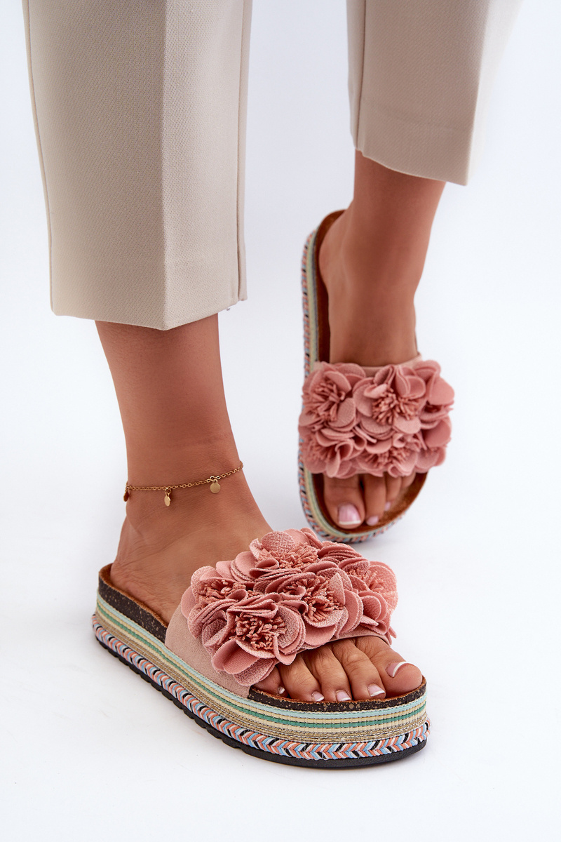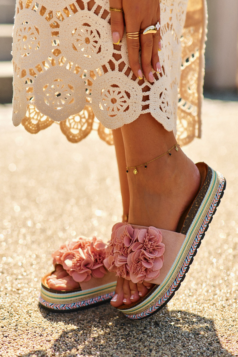 Klapki Damskie Na Platformie Ozdobione Kwiatkami Różowe Nodina