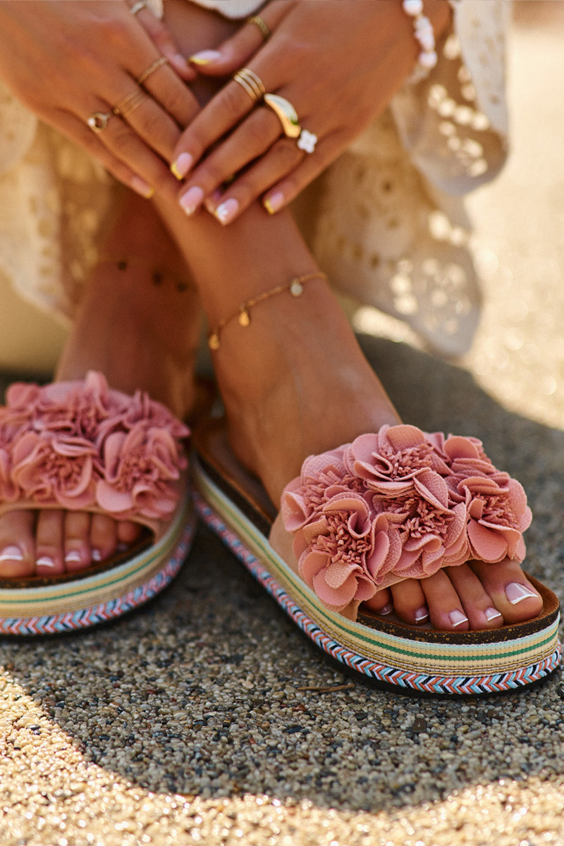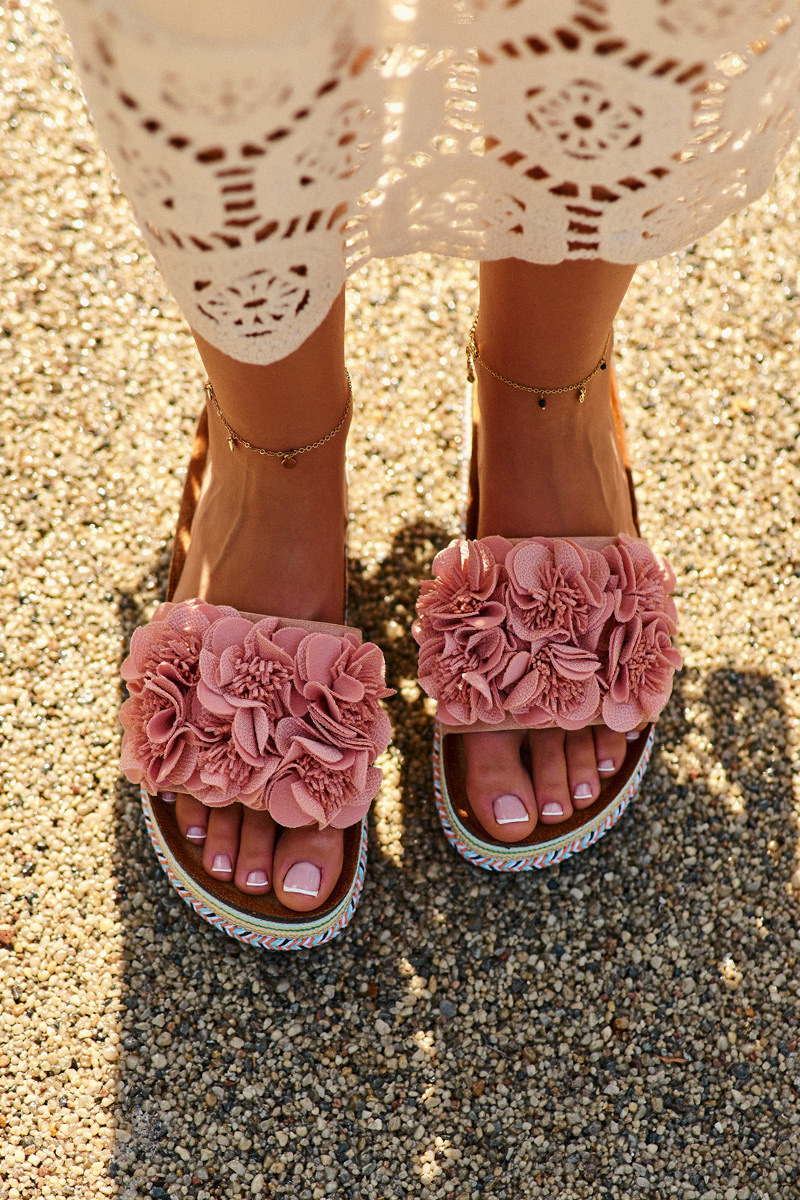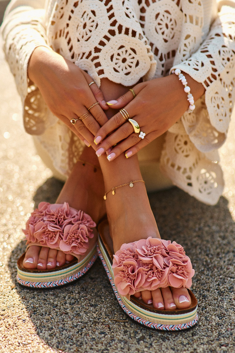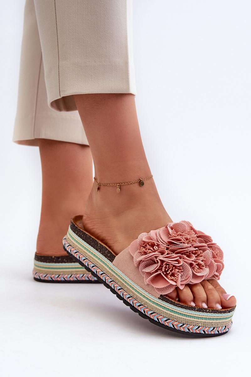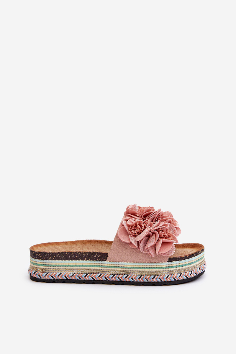 Klapki Damskie Na Platformie Ozdobione Kwiatkami Różowe Nodina