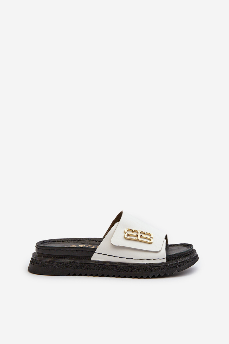 Klapki damskie wykonane ze skóry naturalnej. Osadzone na platformie. Pasek ozdobiony złotym detalem dodaje im elegancji. Idealne na letnie dni, te klapki doskonale dopełnią każdą stylizację, łącząc funkcjonalność z modnym wyglądem. Przy wyborze rozmiaru prosimy sugerować się tabelą rozmiarów.