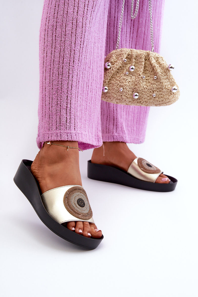 Skórzane Klapki Damskie Z Ozdobą S.Barski KV27-019 Złote