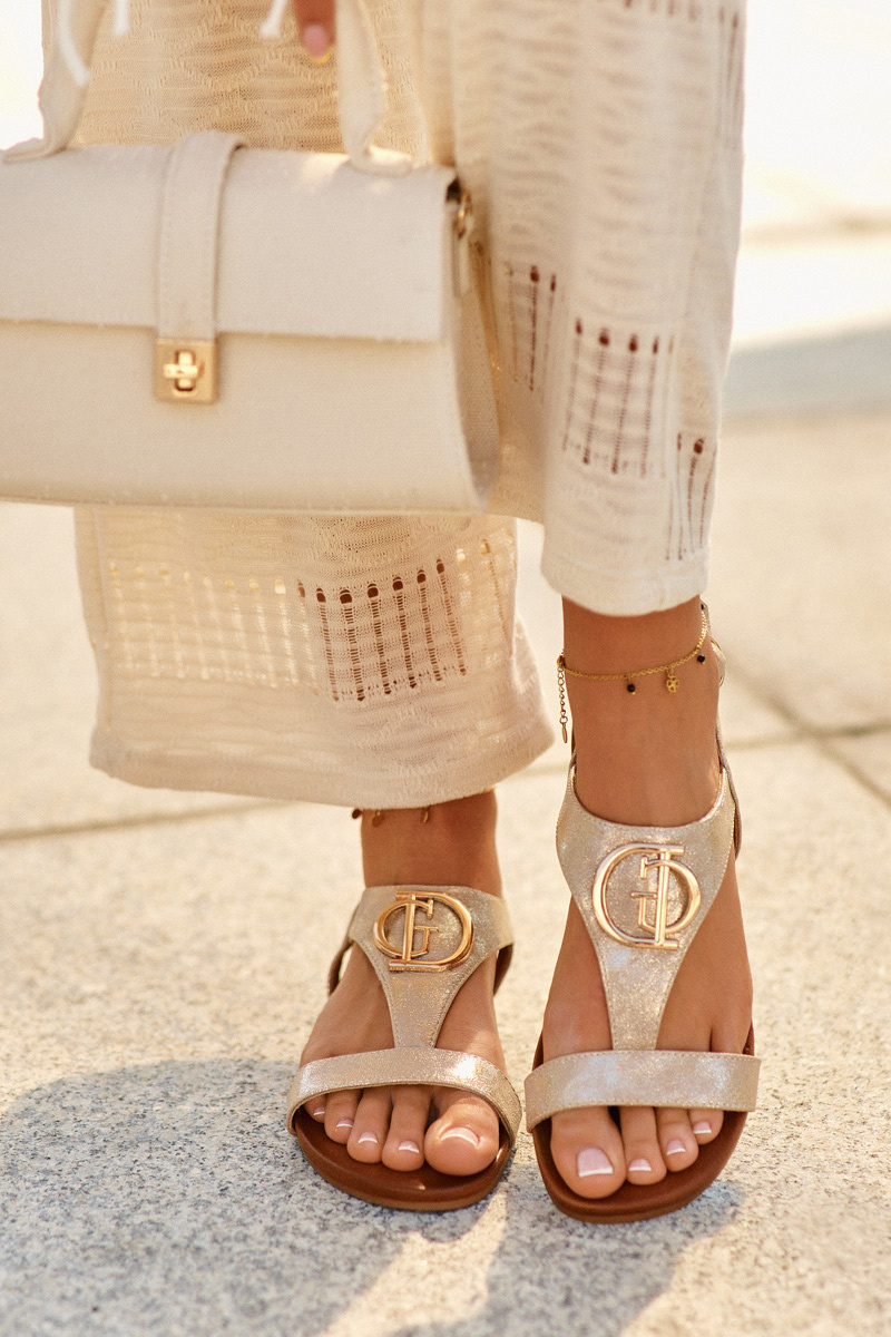 Sandały damskie od marki S.barski. Wykonane ze skóry ekologicznej. Osadzone na płaskim obcasie, Zapinane na regulowany pasek ze sprzączką, zapewniają idealne dopasowanie. Złota ozdoba dodaje elegancji. Model ten będzie doskonałym wyborem na wiele okazji. Przy wyborze rozmiaru prosimy kierować się tabelą rozmiarów.