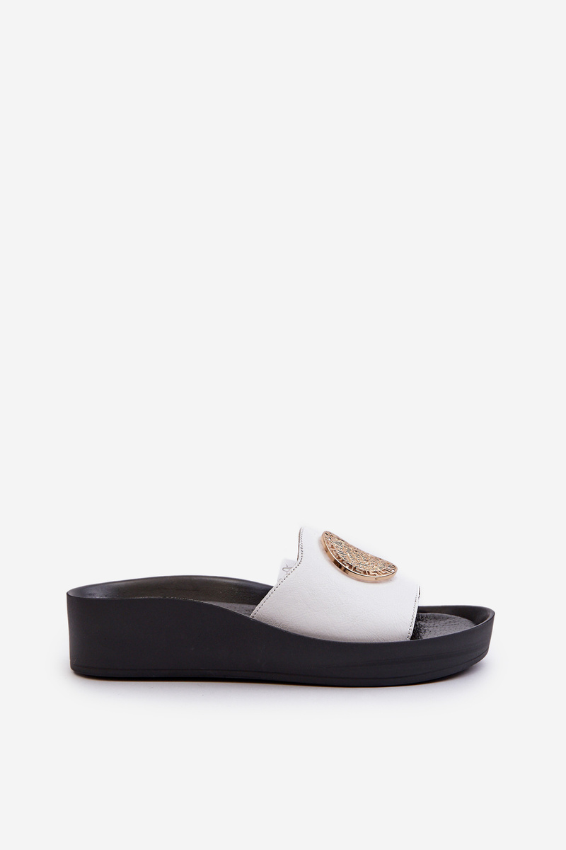 Zazoo 2920 Skórzane Klapki Damskie Na Koturnie Ze Złotym Detalem Białe