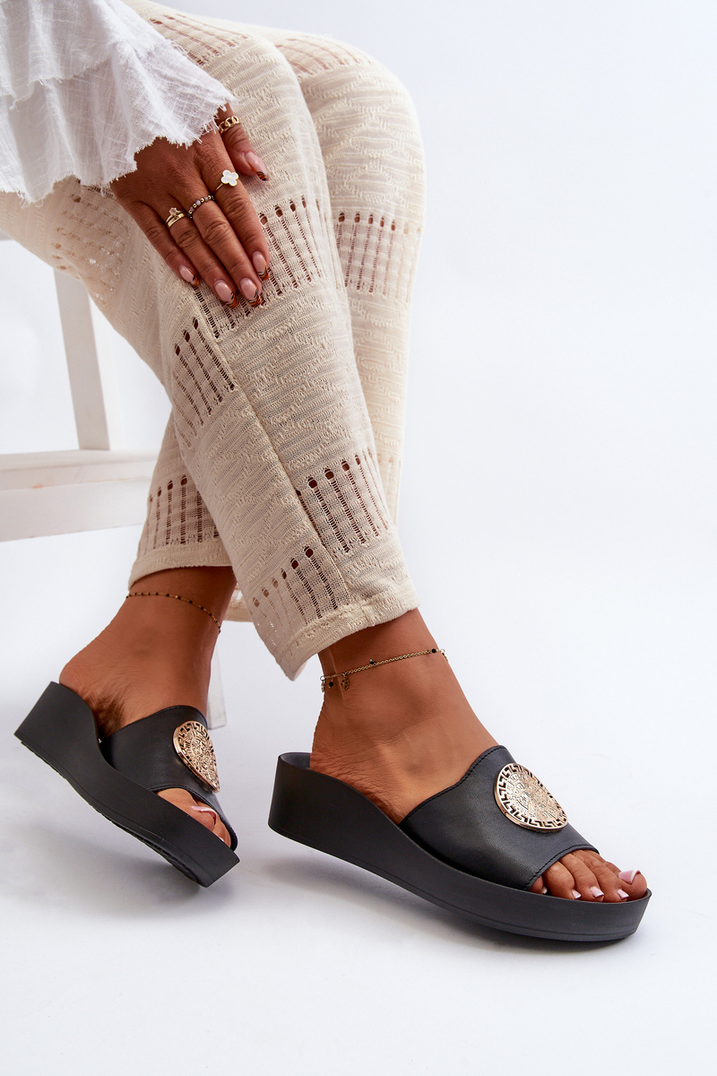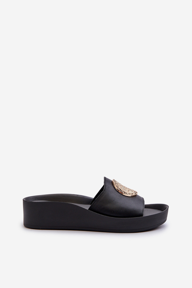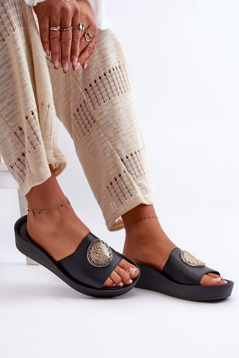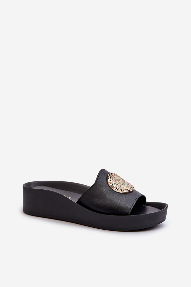 Zazoo 2920 Skórzane Klapki Damskie Na Koturnie Ze Złotym Detalem Czarne