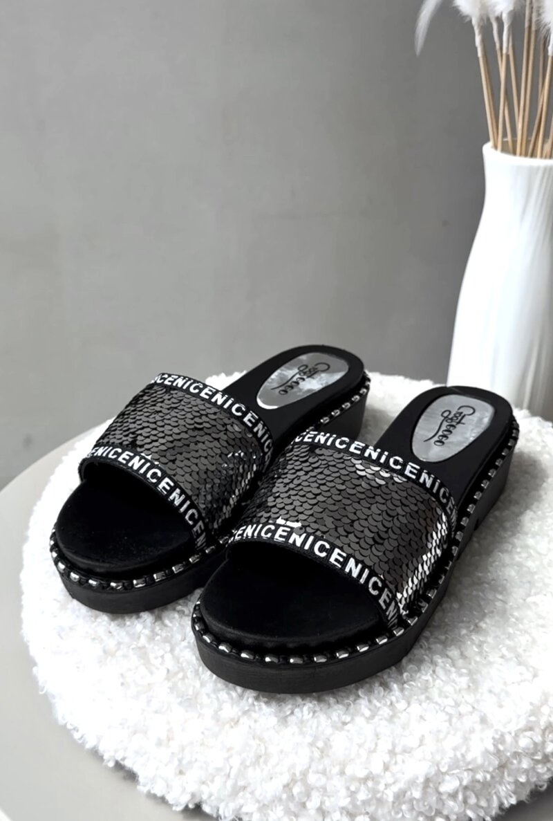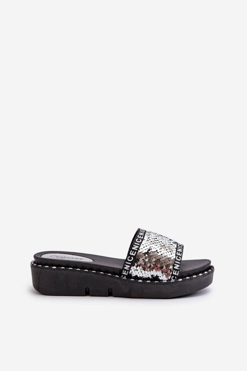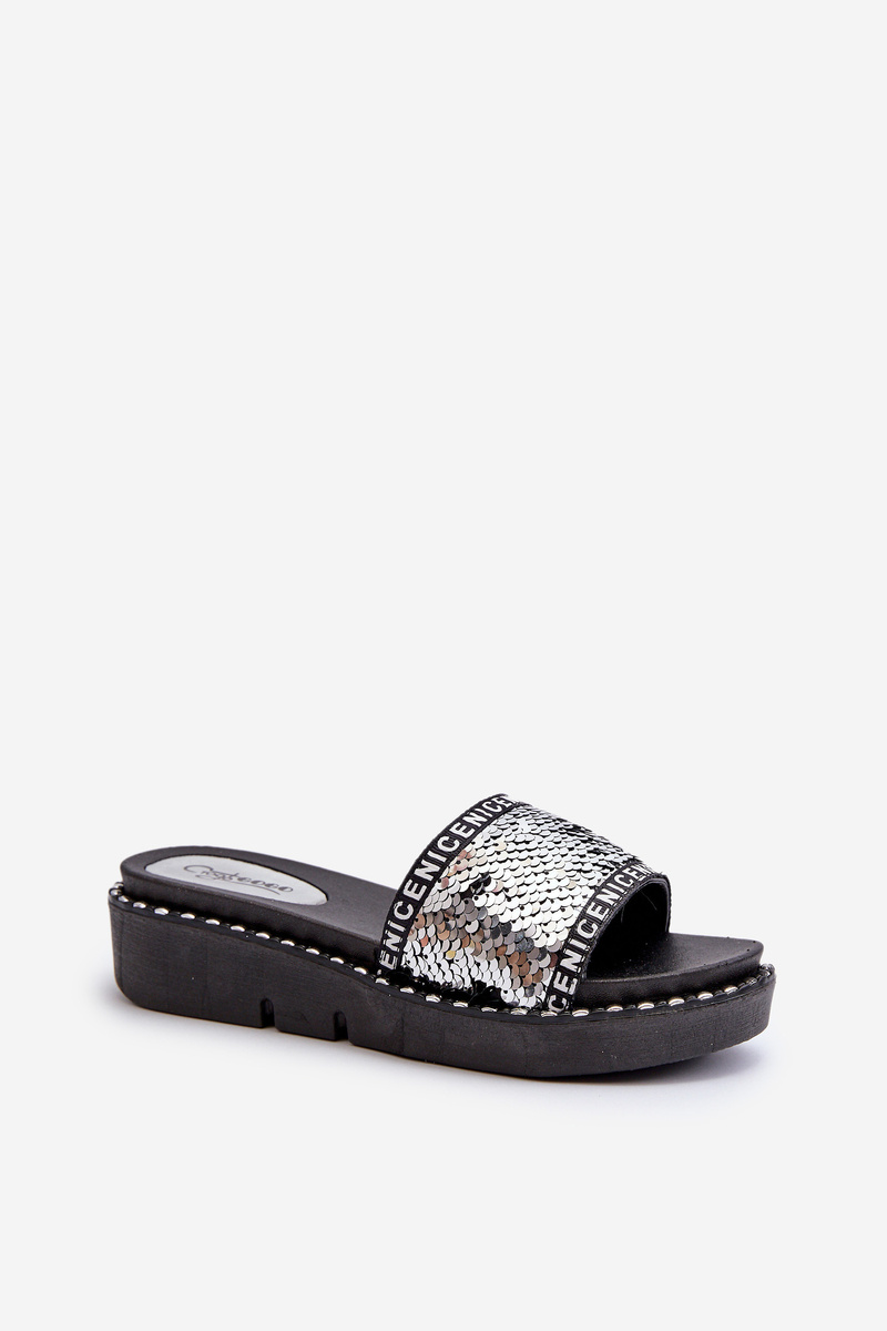 Klapki Damskie Z Cekinami Czarno-Srebrne Rivanique