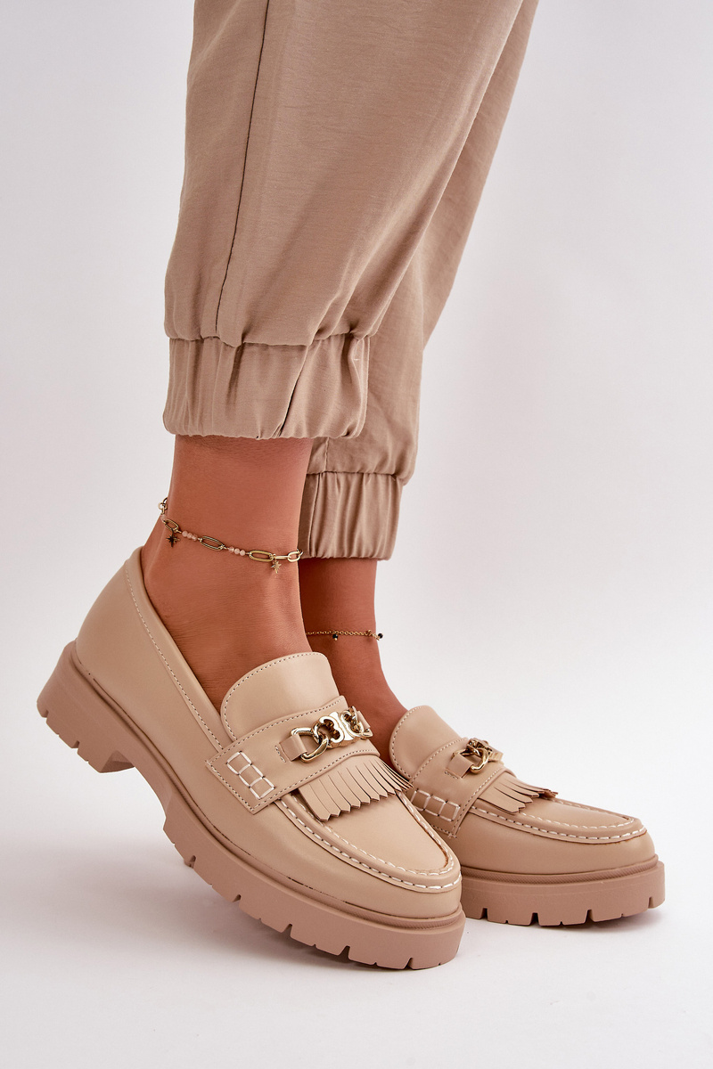 Eko Skórzane Mokasyny Damskie Ze Złotą Ozdobą Beżowe Zanita