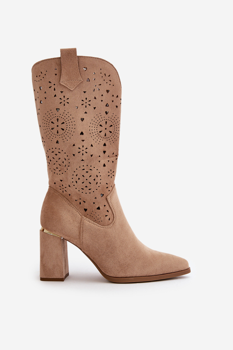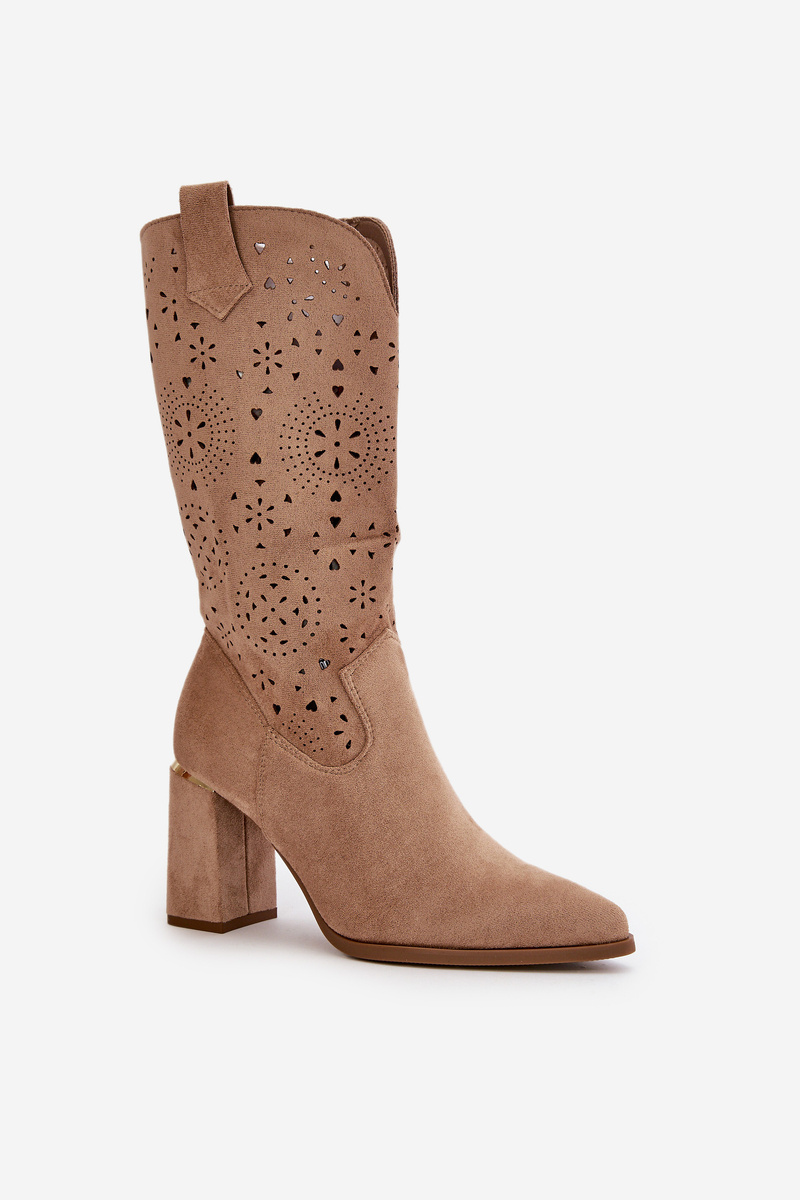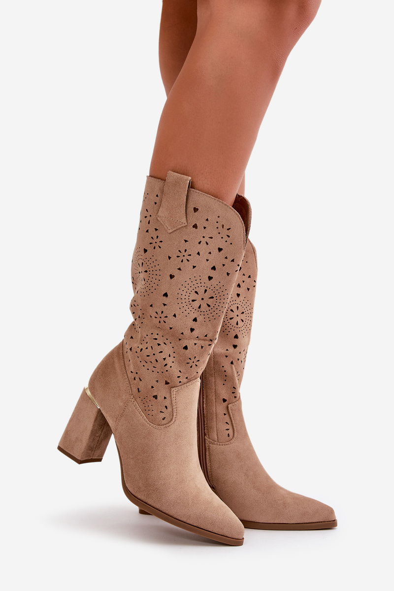 Damskie botki z przyjemnego w dotyku eko zamszu. Posiadają ażurową cholewkę sięgającą do połowy łydki. Osadzone na słupkowym obcasie z lustrzanym akcentem. Zapinane na zamek, z noskami w szpic. Ten modny i elegancki fason będzie idealnym dopełnieniem wielu stylizacji! Przy wyborze rozmiaru prosimy sugerować się tabelą rozmiarów.