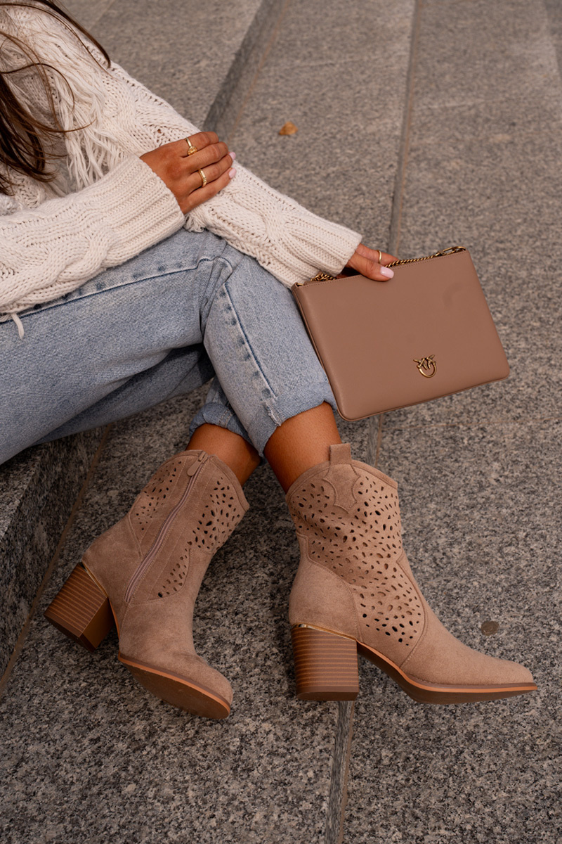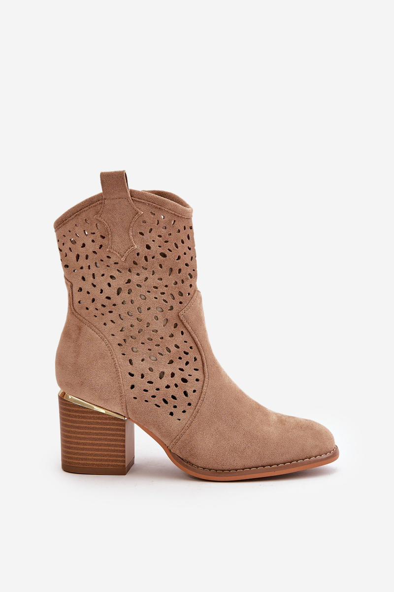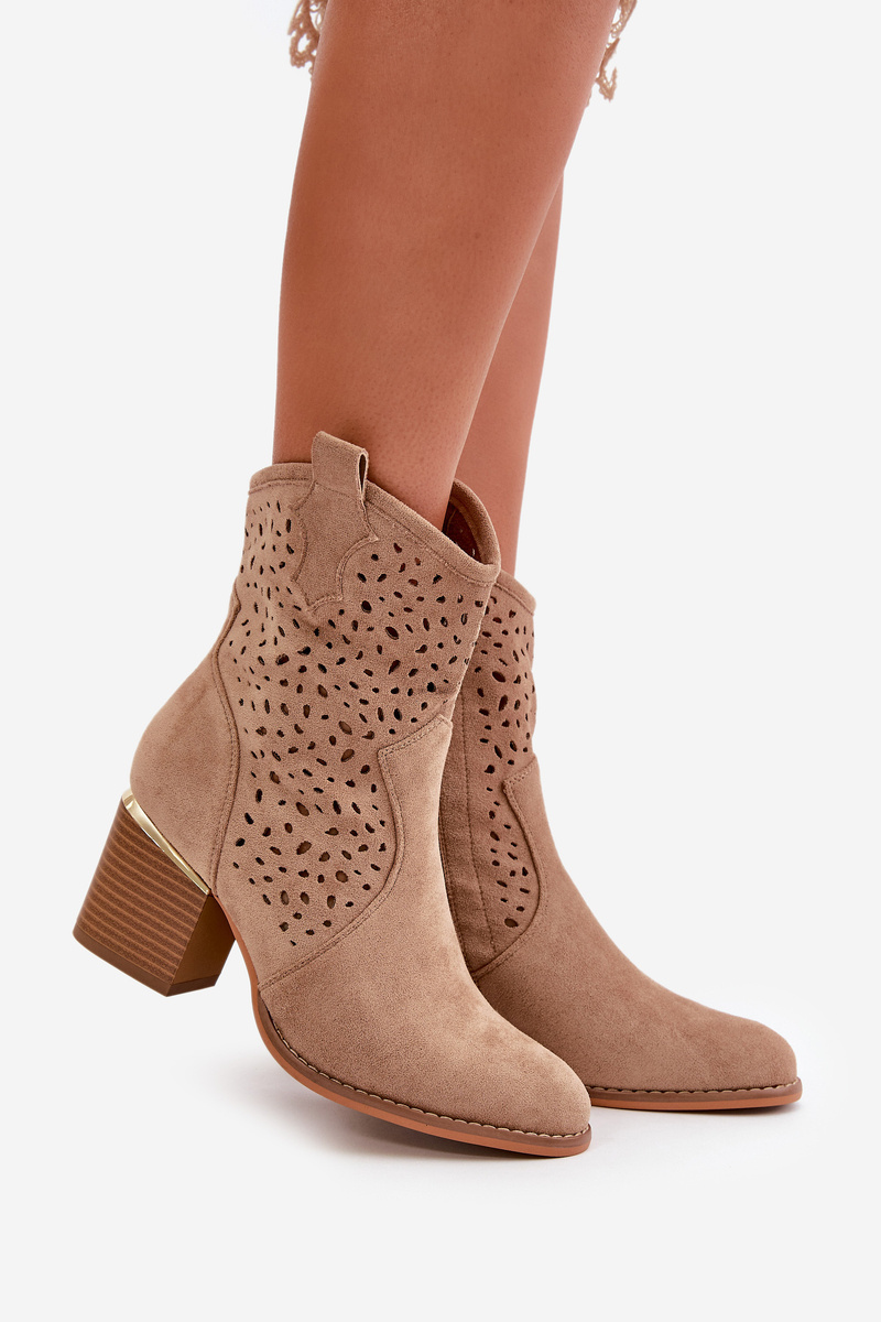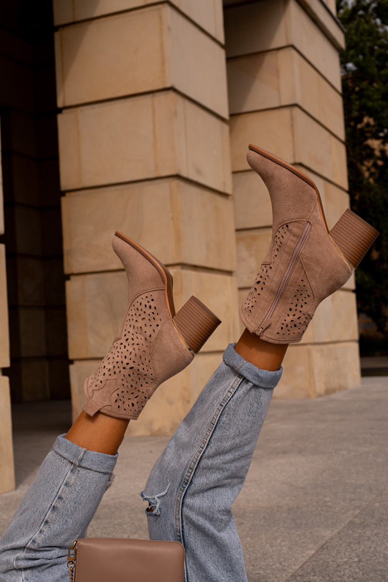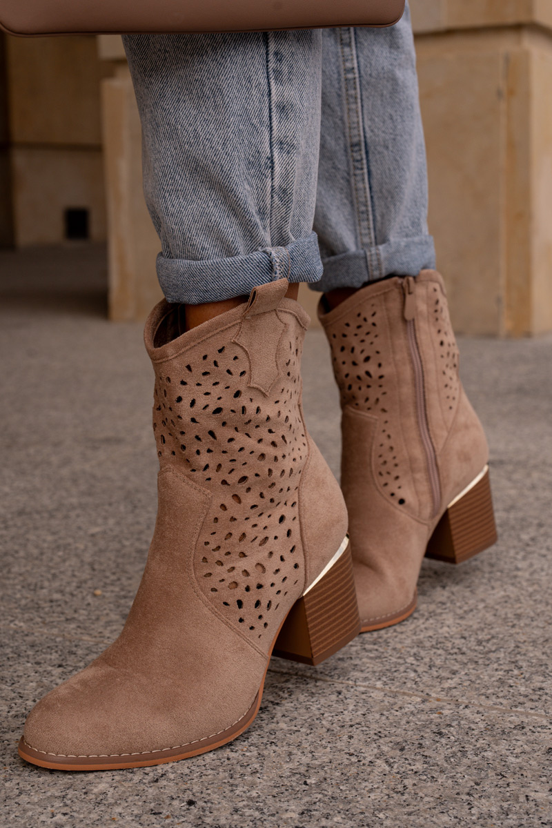 Ażurowe Botki Na Słupku Z Eko Zamszu Zapinane Na Zamek Ciemnobeżowe Sevana