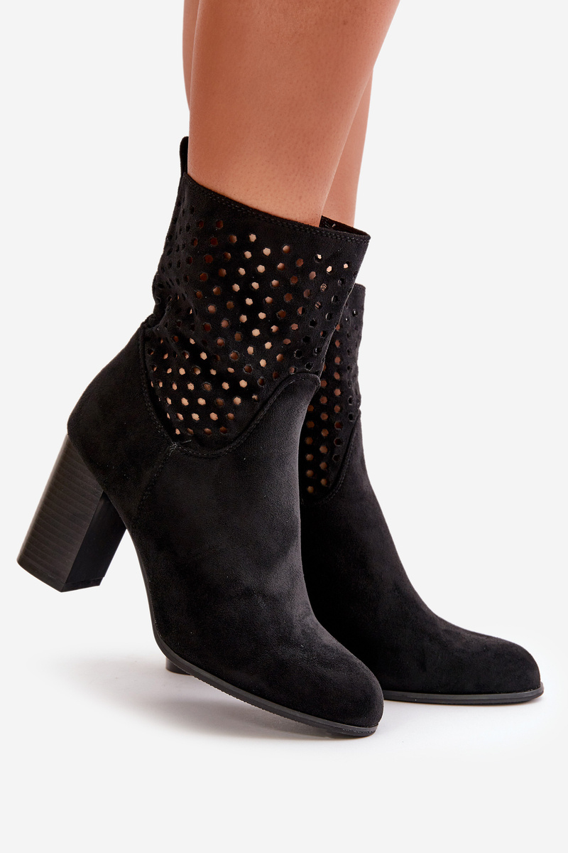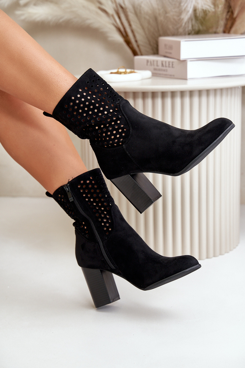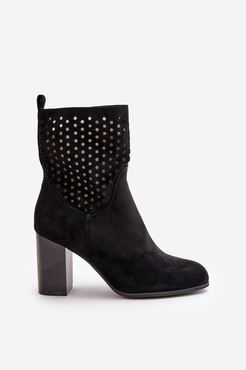 Botki damskie z ażurową cholewką. Wykonane z eko zamszu. Zapinane na zamek, co ułatwia zakładanie i zdejmowanie, oraz zapewnia dobre dopasowanie do stopy. Botki osadzone są na stabilnym obcasie typu słupek, który podkreśla kobiecy wygląd, dodaje kilku centymetrów wzrostu i zapewnia wygodę noszenia. Te stylowe botki świetnie komponują się z różnorodnymi stylizacjami, od casualowych po bardziej eleganckie, będąc doskonałym wyborem na każdą okazję. Przy wyborze rozmiaru prosimy sugerować się tabelą rozmiarów.