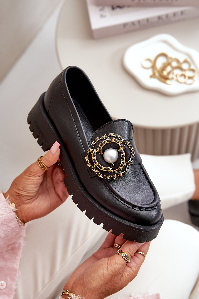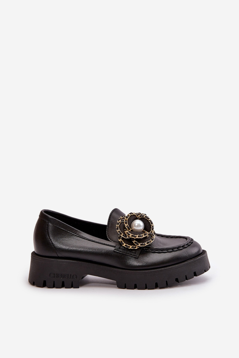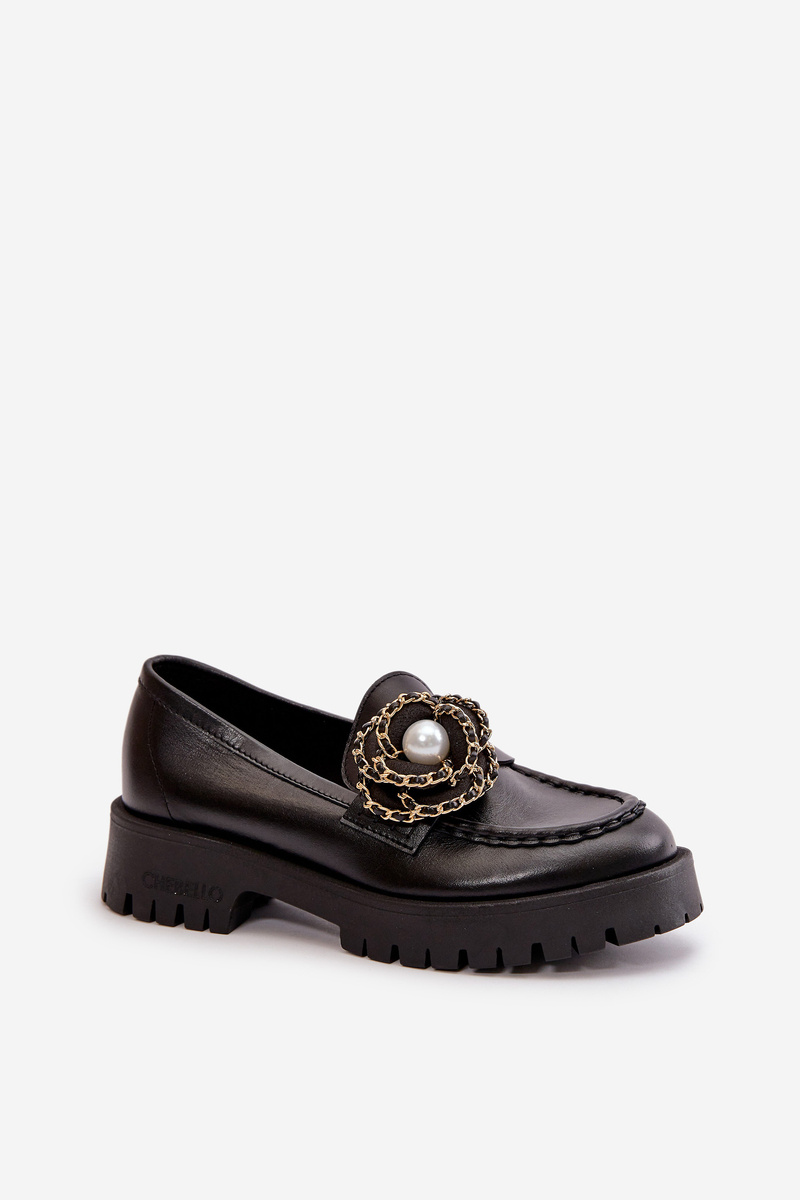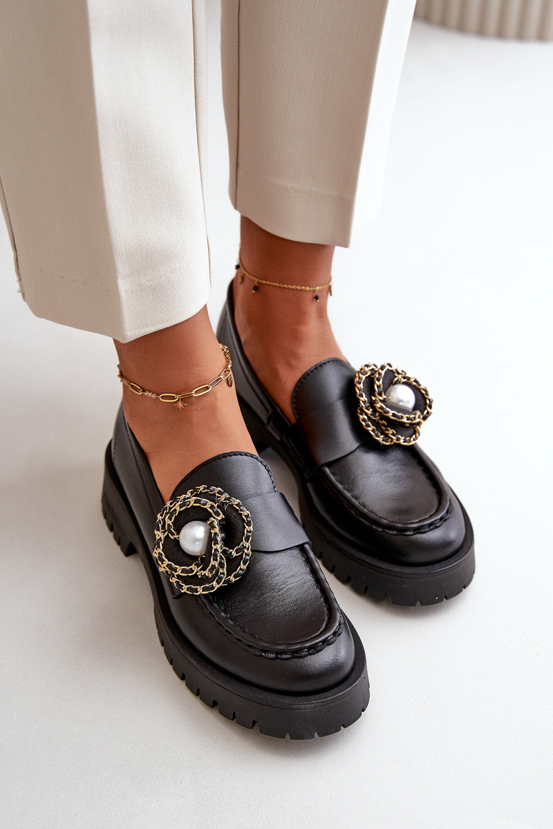 Skórzane Mokasyny Damskie Ozdobione Kwiatkiem Czarne CheBello 4520
