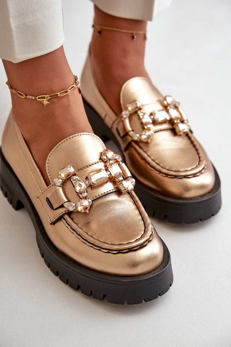 Damskie Skórzane Mokasyny Z Ozdobą CheBello 4369 Złote