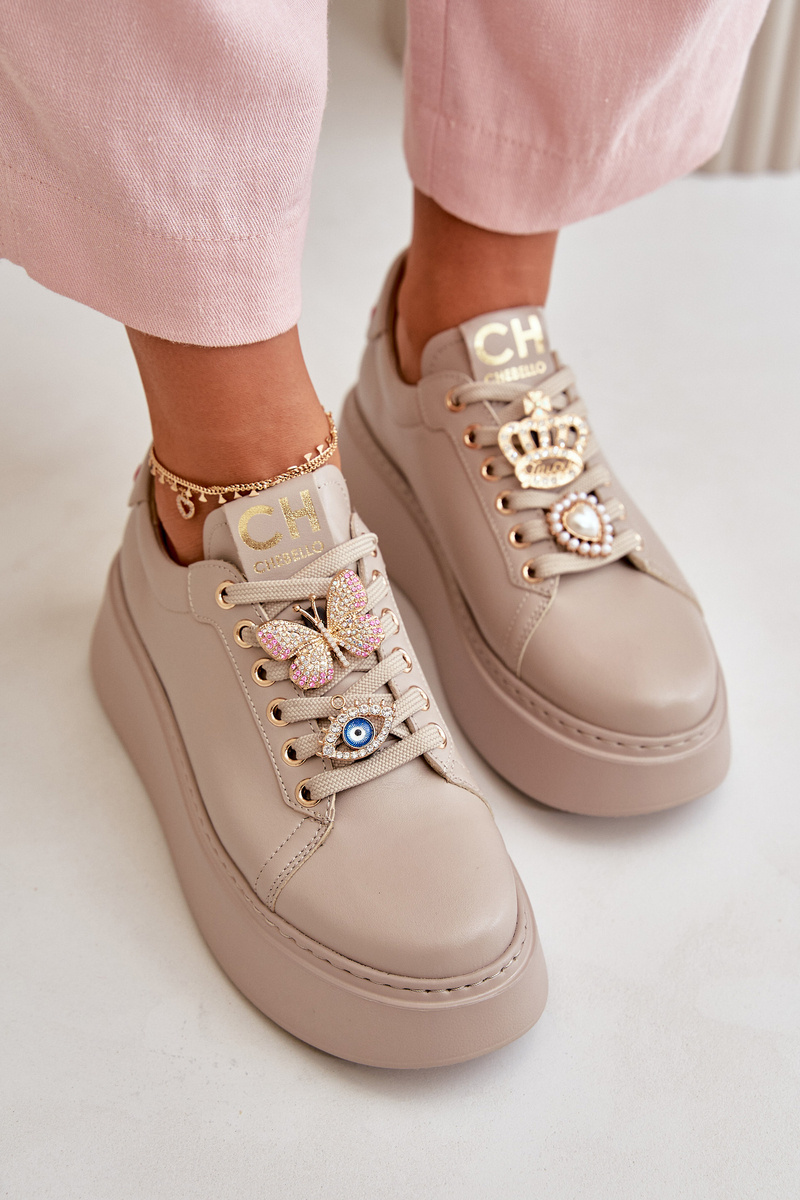 Damskie Skórzane Sneakersy Na Platformie Z Ozdobami CheBello 4585 Beżowe