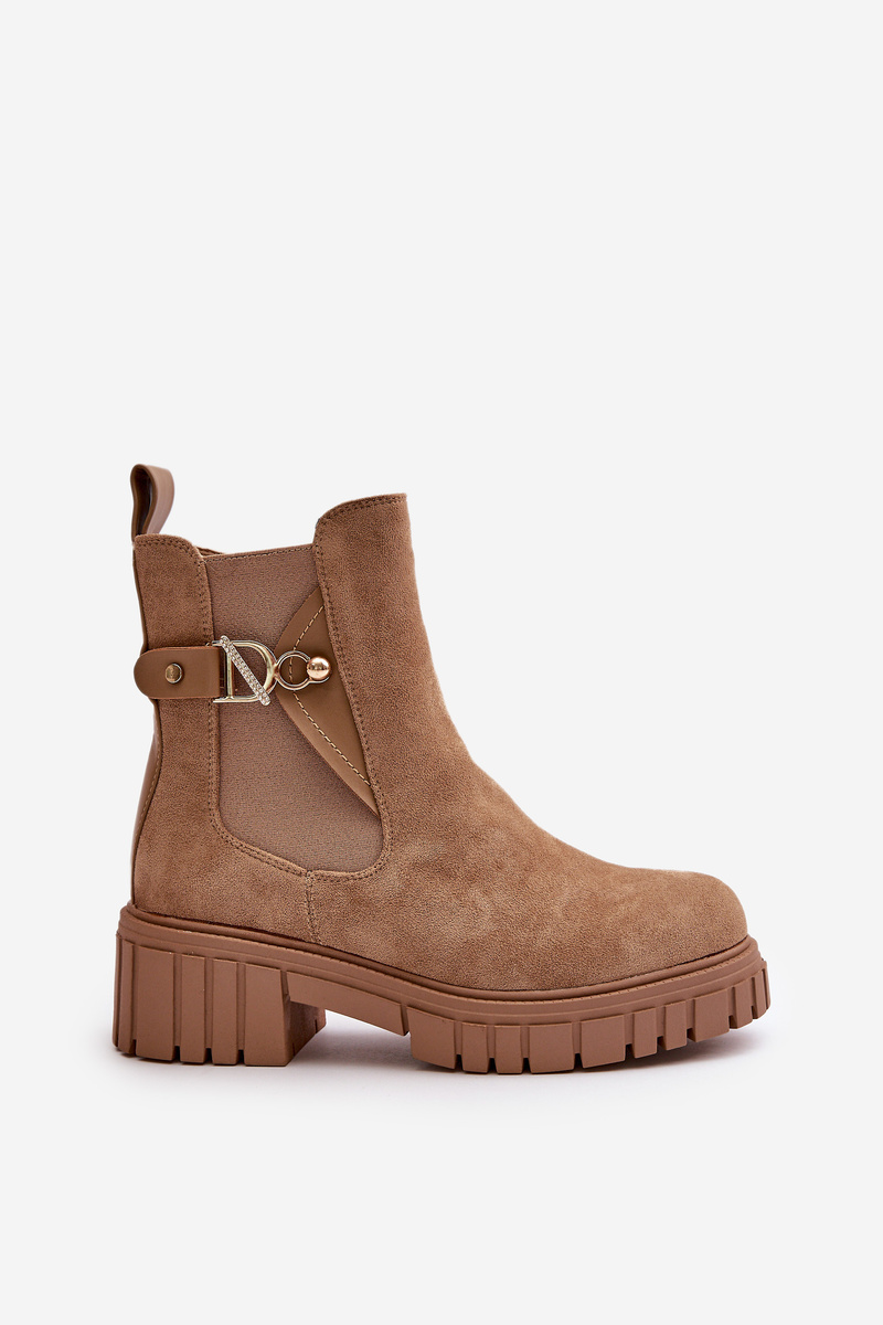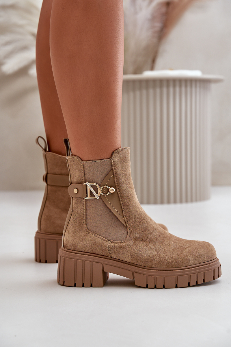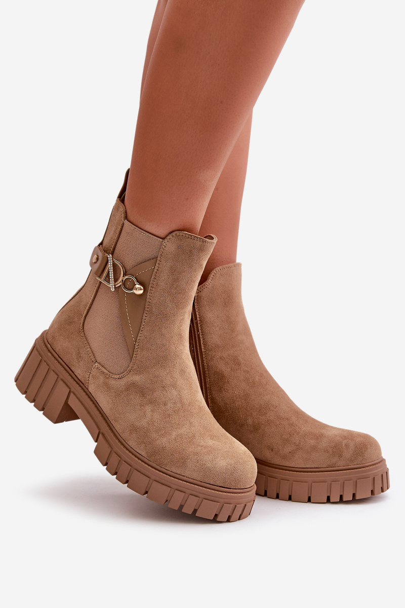 Ocieplane Botki Damskie Ze Złotym Detalem Eko Zamszowe Beżowe Bervena