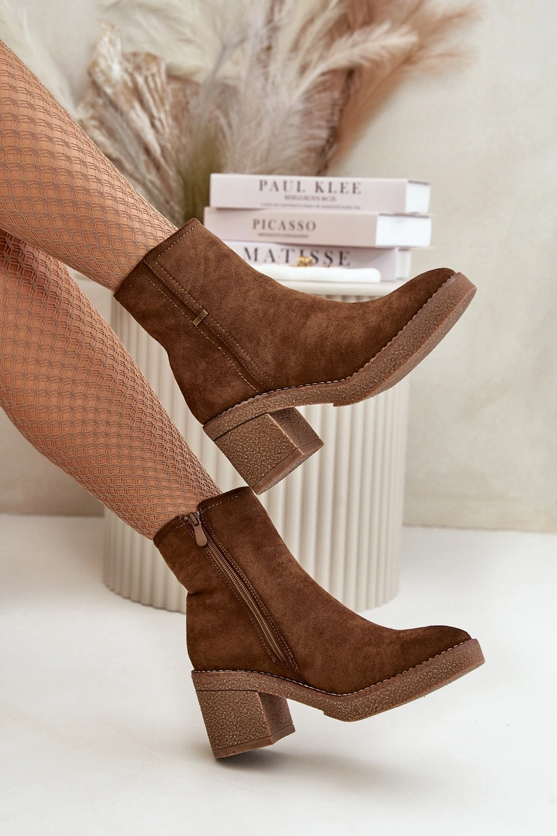 Botki Damskie Na Słupku Ocieplane Eko Zamszowe Brązowe Arkesia