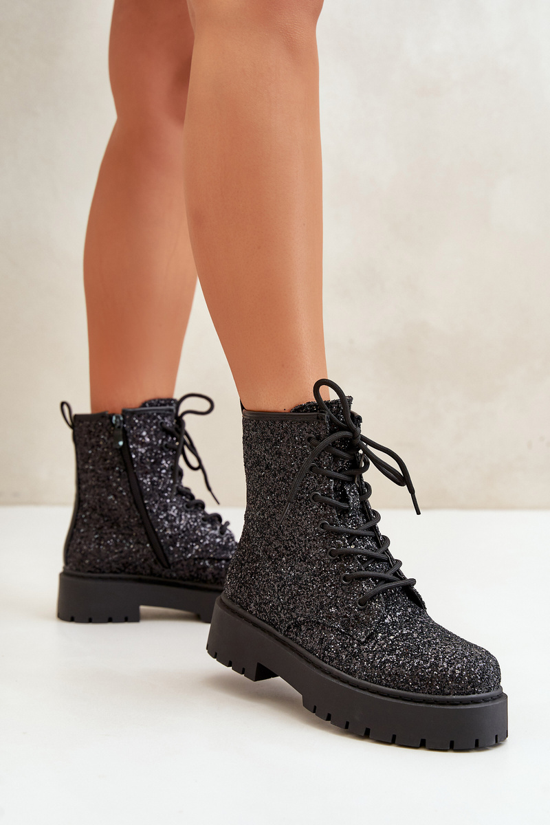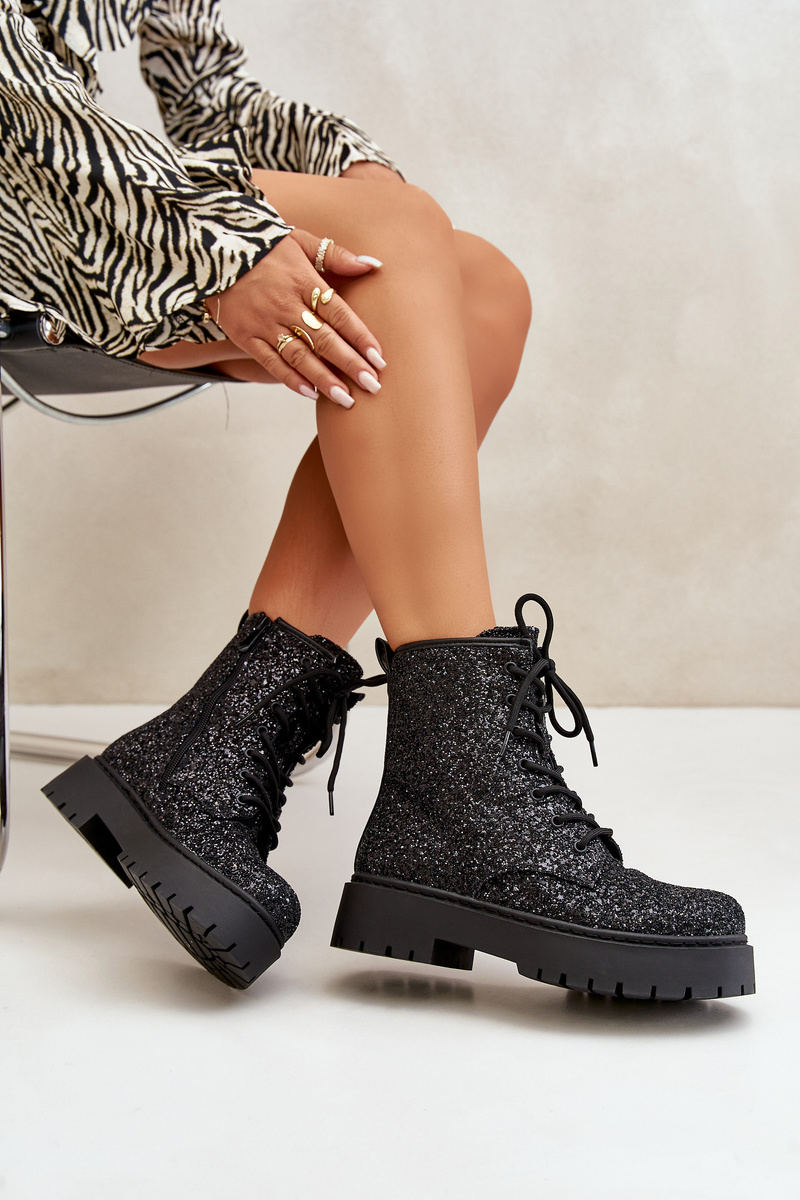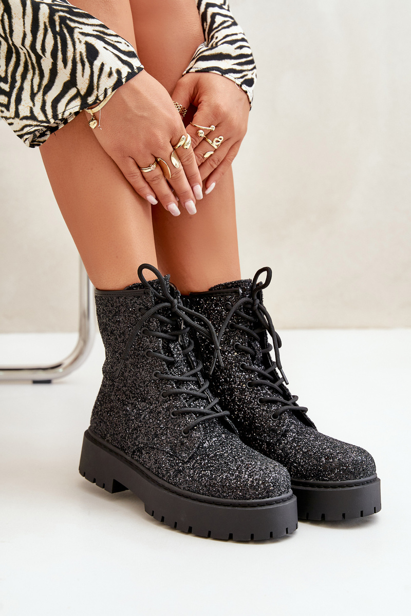 Ocieplane Botki Workery Damskie Ozdobione Cekinami Czarne Liatheine