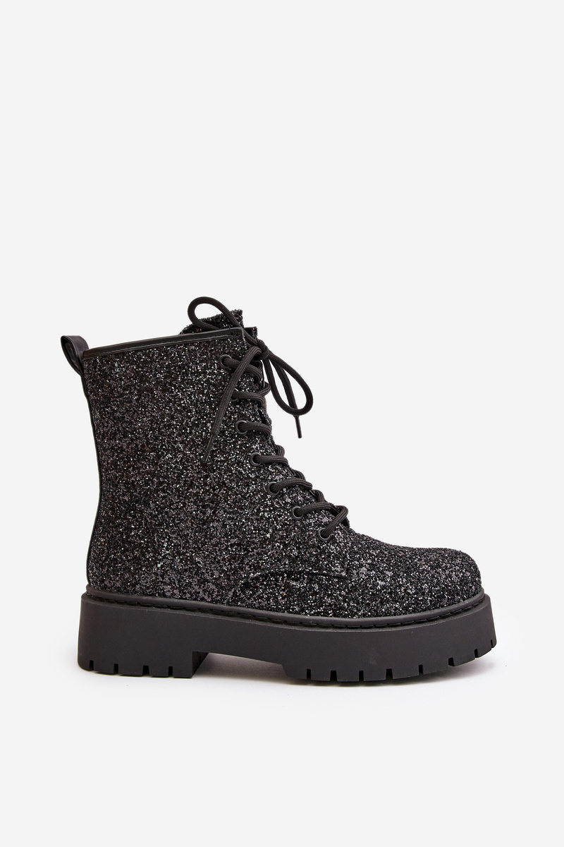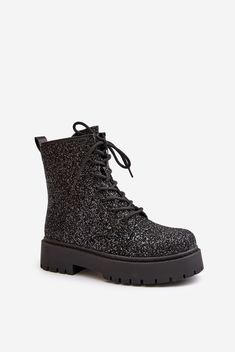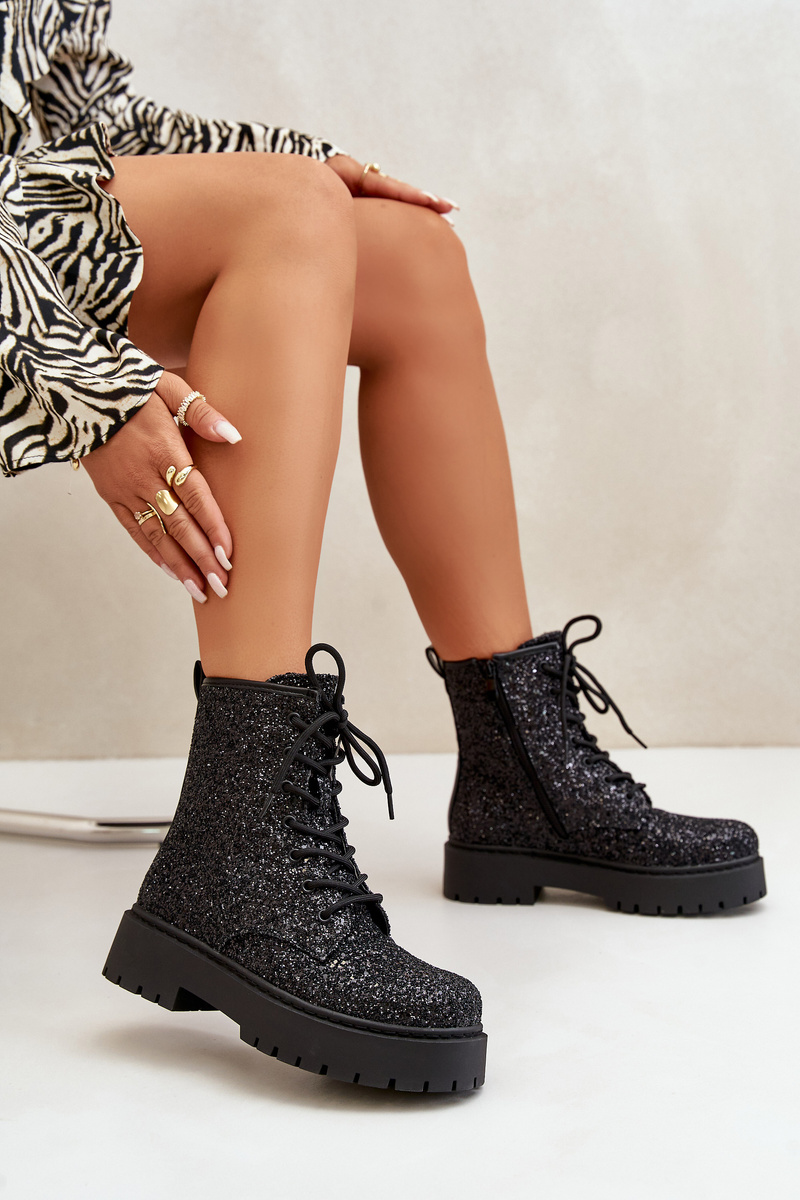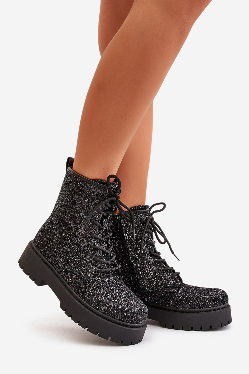 Ocieplane Botki Workery Damskie Ozdobione Cekinami Czarne Liatheine