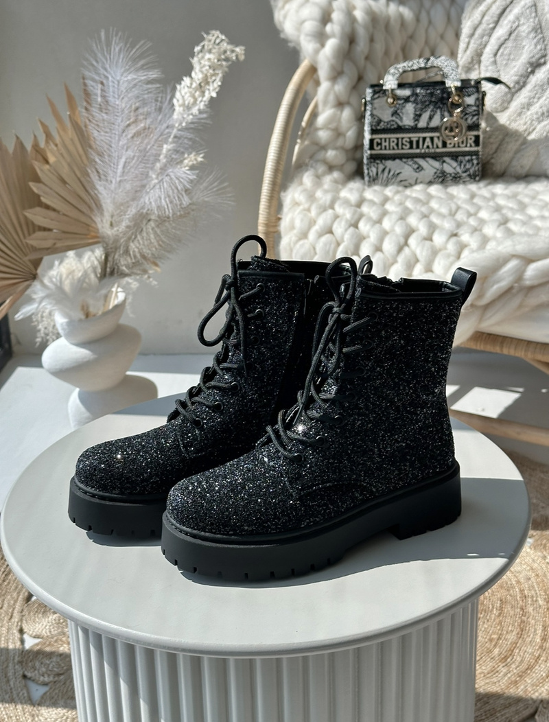 Stylowe damskie botki to niezbędny element jesienno-zimowej garderoby. Model ten wyróżnia się cholewką z licznymi błyszczącymi cekinami. Zapinane na zamek oraz dodatkowo posiadają sznurowanie. Środek ocieplony kocem obuwniczym, co zapewni ciepło w mroźne dni. Doskonale sprawdzą się w różnych stylizacjach! Przy wyborze rozmiaru prosimy sugerować się tabelą rozmiarów.