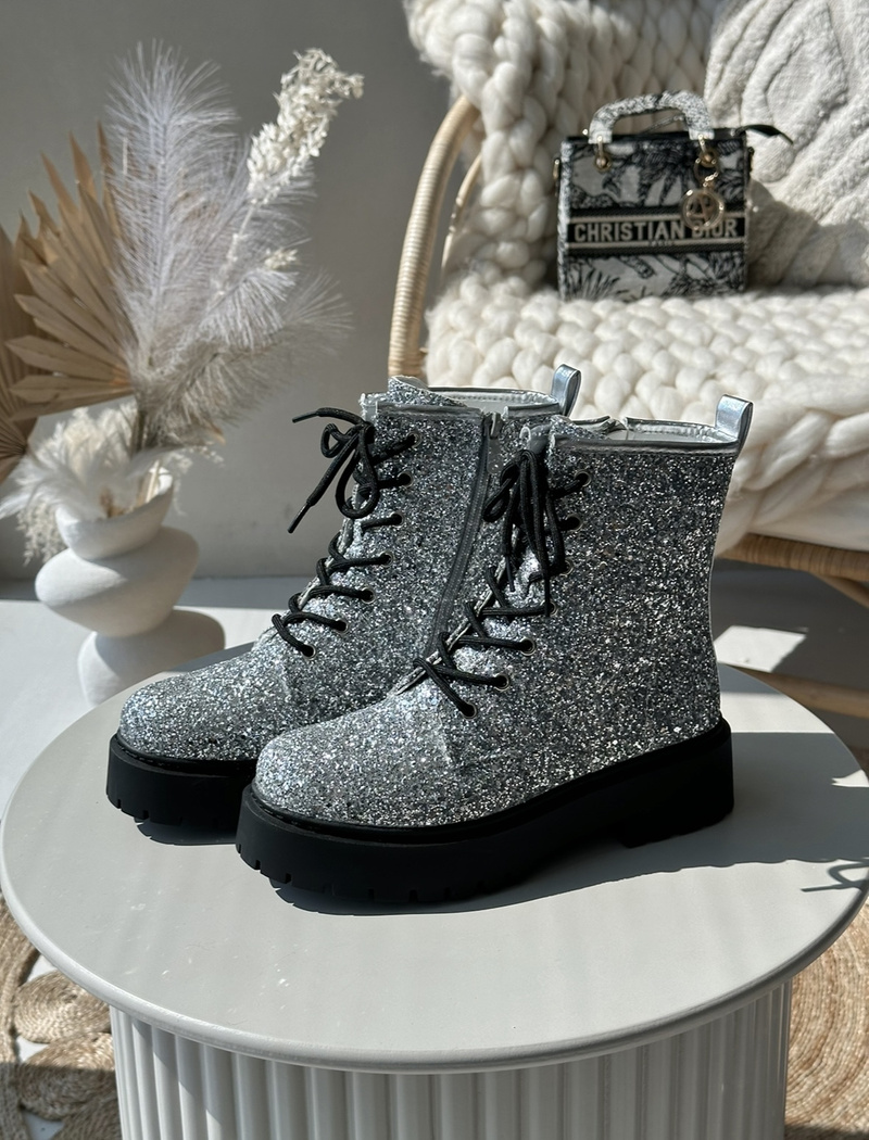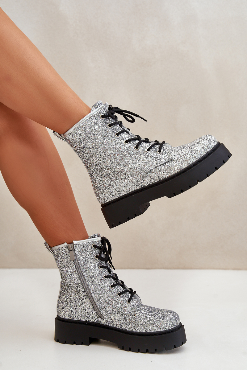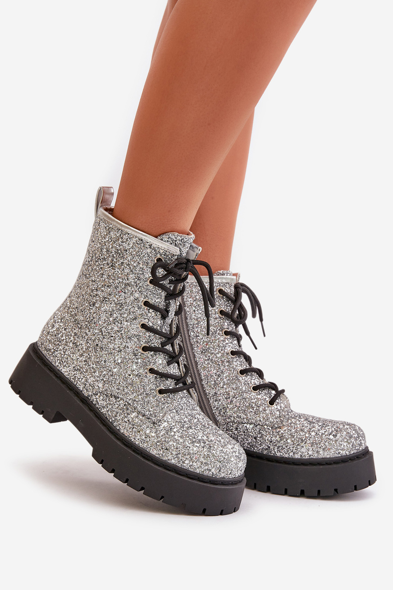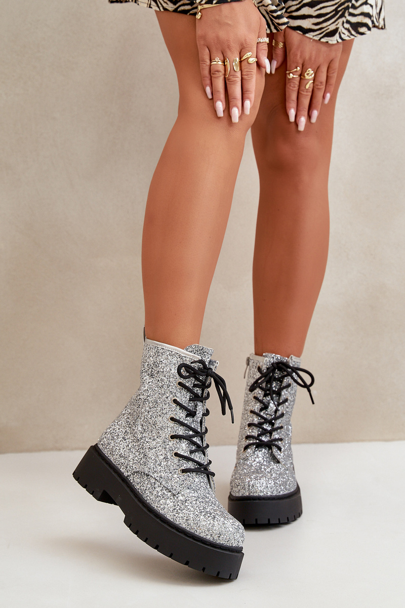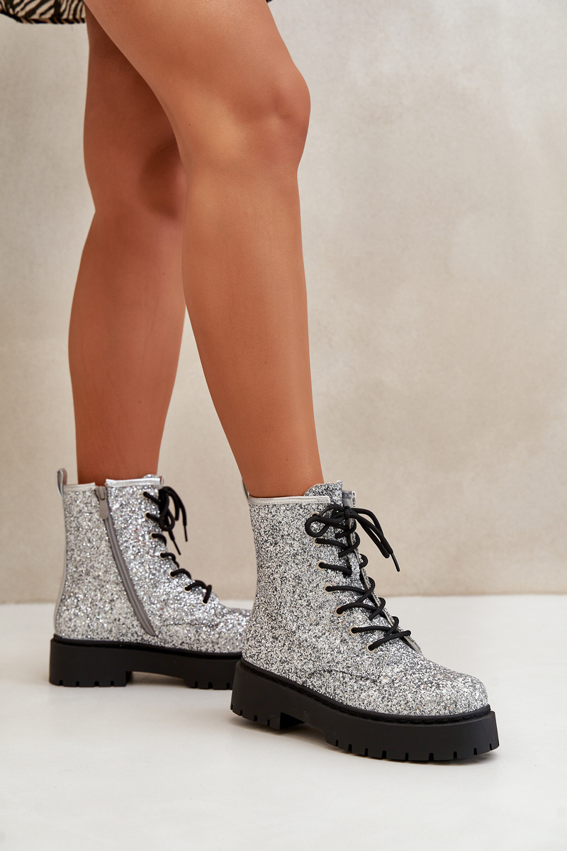 Ocieplane Botki Workery Damskie Ozdobione Cekinami Srebrne Liatheine