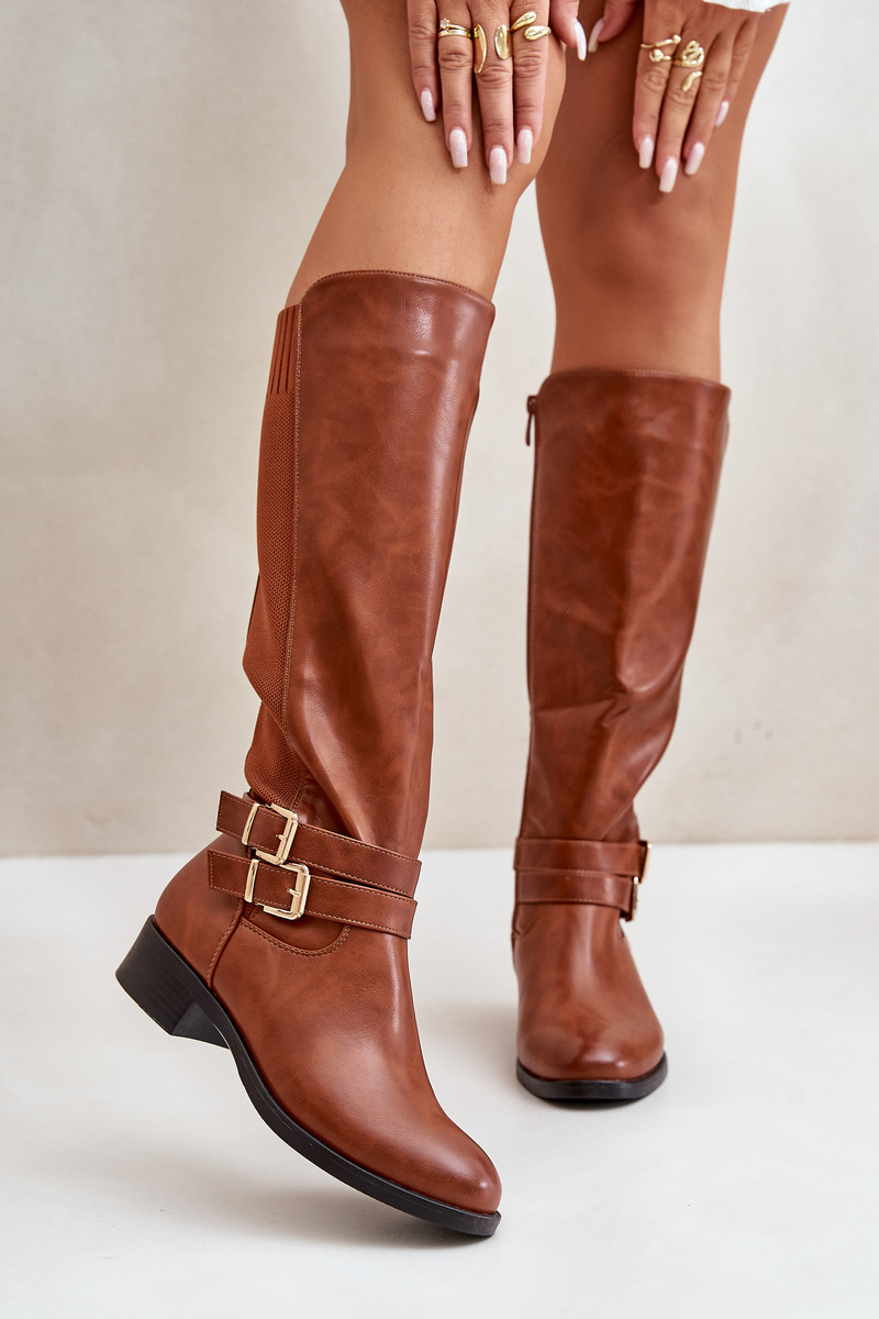 Kozaki Damskie Przed Kolano Na Płaskim Obcasie Z Klamrami Camel Lotina