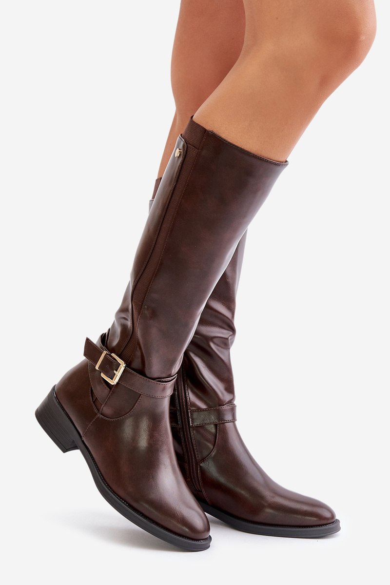 Damskie Ocieplane Kozaki Na Płaskim Obcasie Ze Złotą Klamrą Brązowe Arsisna