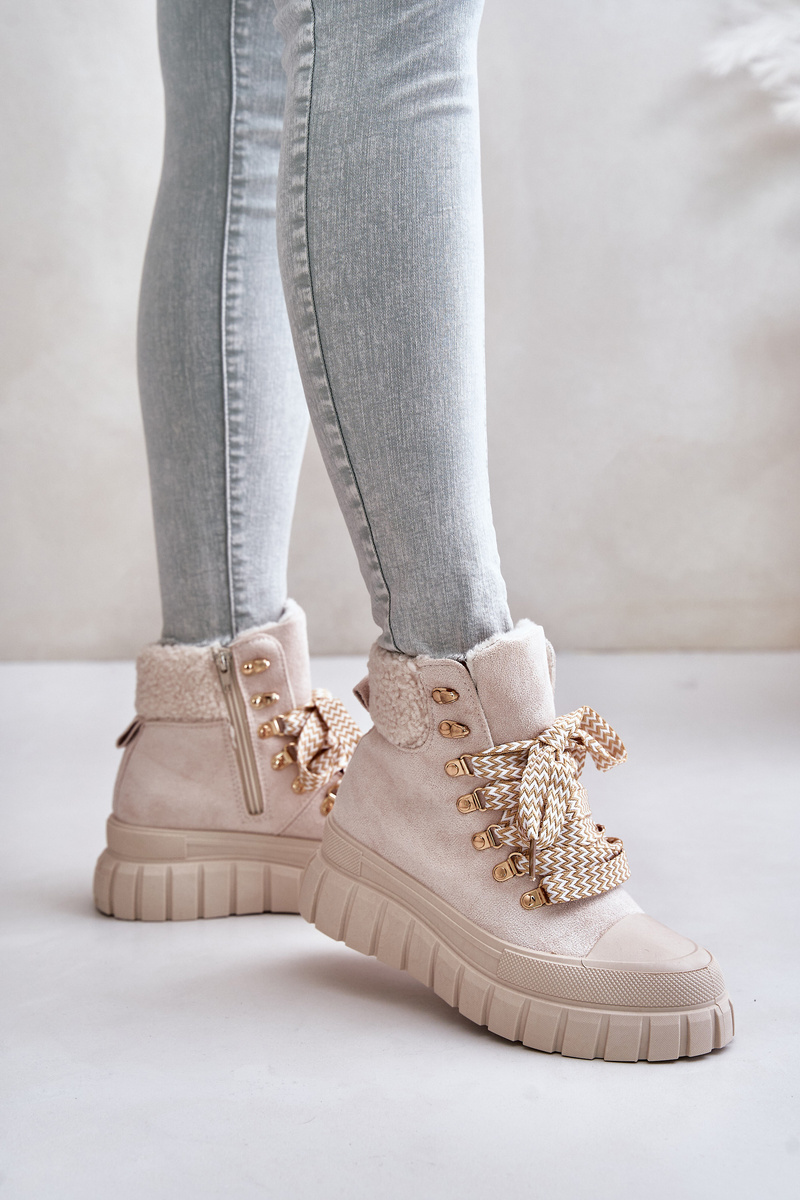 Damskie Ocieplane Botki Trapery Na Platformie Beżowe Alcyhen