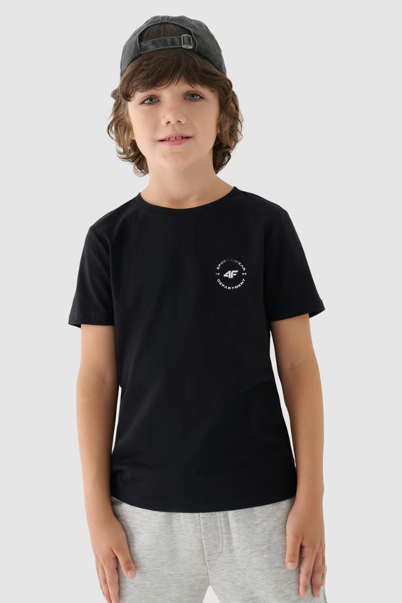 T-shirt bez nadruku chłopięcy idealnie sprawdzi się jako element zarówno casualowych, jak i sportowych stylizacji na co dzień. Posiada krój regular, który wygodnie dopasowuje się do sylwetki oraz standardową długość sięgającą do linii bioder. Splot single jersey z jednostronną gładką powierzchnią sprawia, że koszulka jest elastyczna i komfortowa w noszeniu. Koszulka bez nadruku chłopięca jest miękka, lekka i przewiewna. Doskonale nadaje się do noszenia zwłaszcza w okresie letnim bądź jako podkoszulek pod bluzę czy koszulę. T-shirt 4F chłopięcy jest wykonany w 100% z bawełny, dzięki czemu jest miękki, trwały i przyjemny w dotyku. Okrągły dekolt jest zakończony lekkim ribowaniem. Z przodu widoczny napis "4F Sportswear Department".