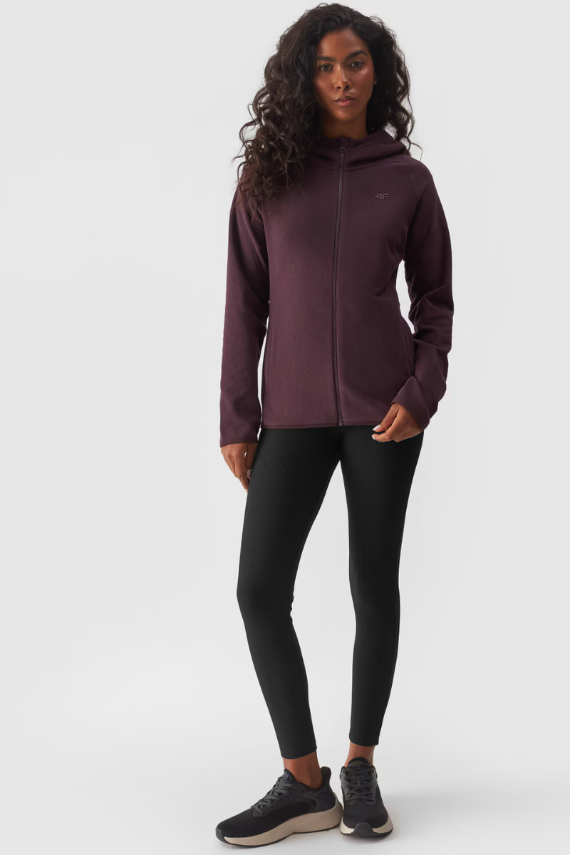 Bluza damska jest wykonana z gładkiego i miękkiego w dotyku polaru, który cechuje się bardzo dobrą izolacją termiczną, a przy tym oddycha i szybko schnie. Technologia 4FWarm wspiera komfort cieplny. Ciepły polar damski posiada stójkę z nieodpinanym kapturem bez regulacji. Mankiety zakończone elastyczną lamówką. Po bokach znajdują się 2 kieszenie otwarte. Zapinany na jednokierunkowy zamek główny. Raglanowe rękawy nie ograniczają ruchów. Materiał główny: Poliester 100% Podszewka: Bawełna 60%, Poliester 40%