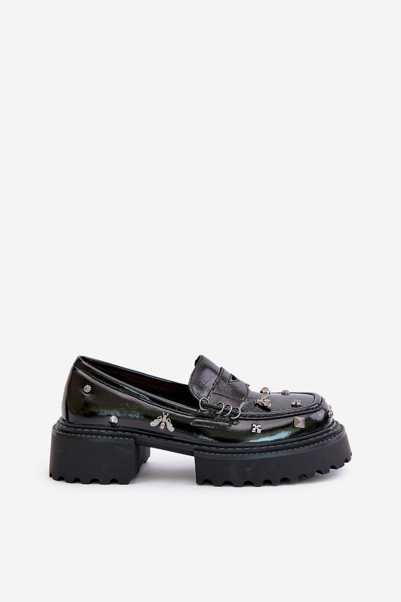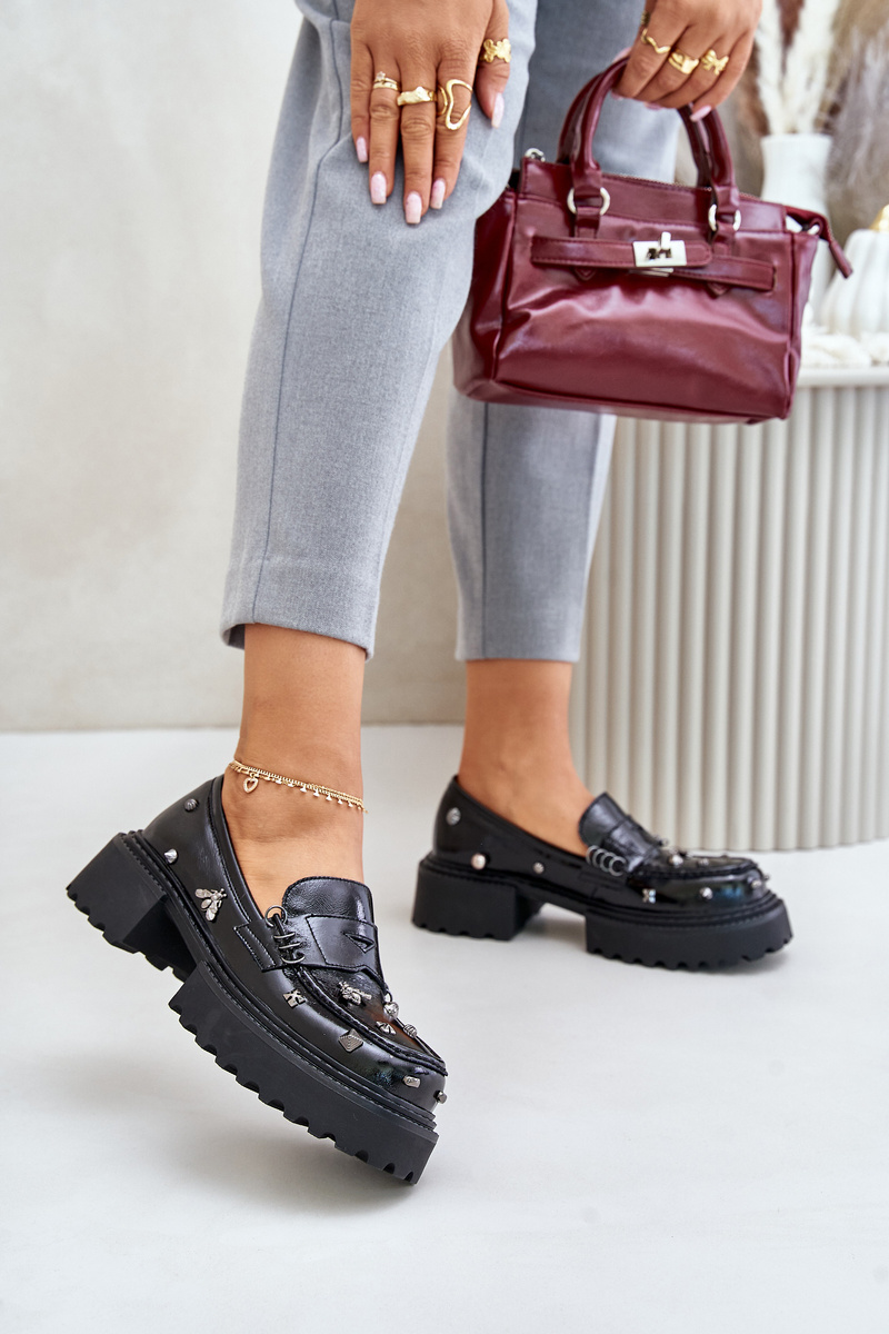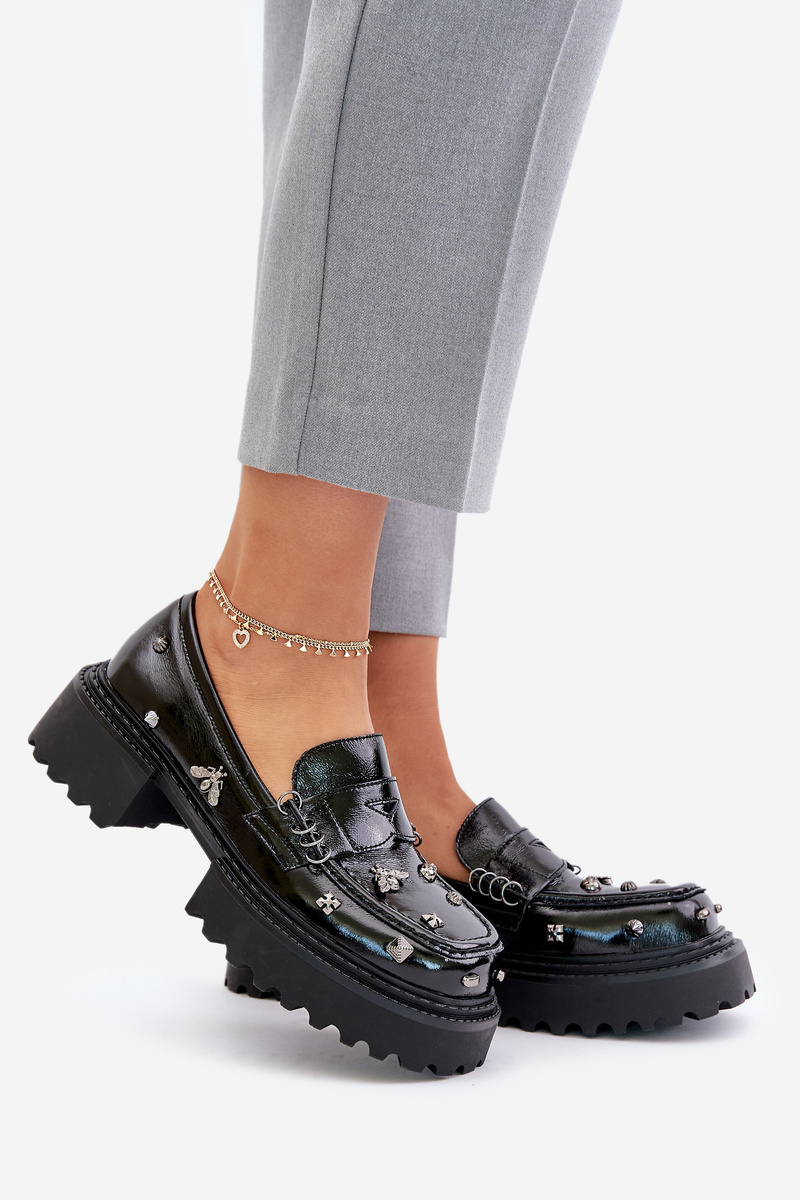 Skórzane Lakierowane Półbuty Damskie Z Ozdobami D&A MR880-103 Czarne