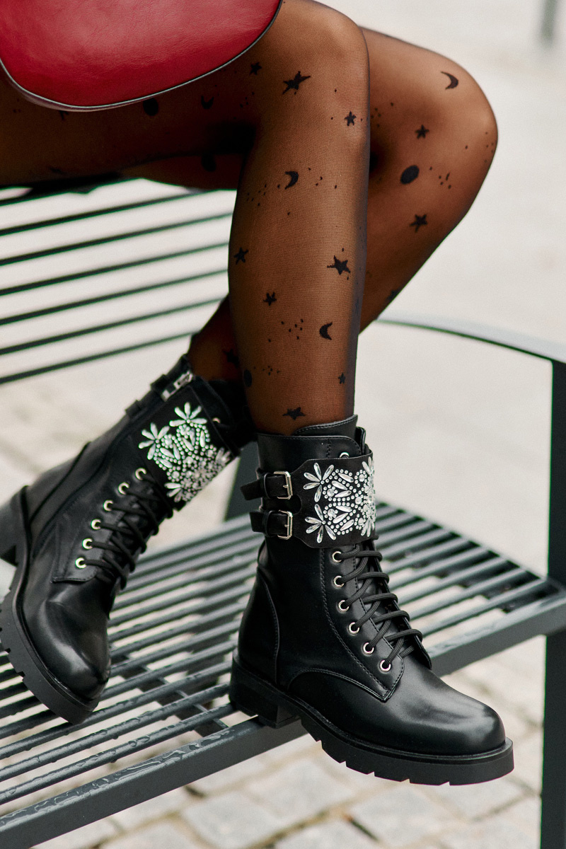 Botki wykonane z eko skóry to stylowy i funkcjonalny wybór na chłodniejsze dni. Ocieplane wnętrze zapewnia ciepło, a połączenie sznurowania i zamka gwarantuje wygodę zakładania. Model wyróżnia się szerokim, zdobionym paskiem z przodu z klamrami, co dodaje im wyrazistego i modnego charakteru. Idealne do casualowych stylizacji. Przy wyborze rozmiaru prosimy kierować się tabelą rozmiarów