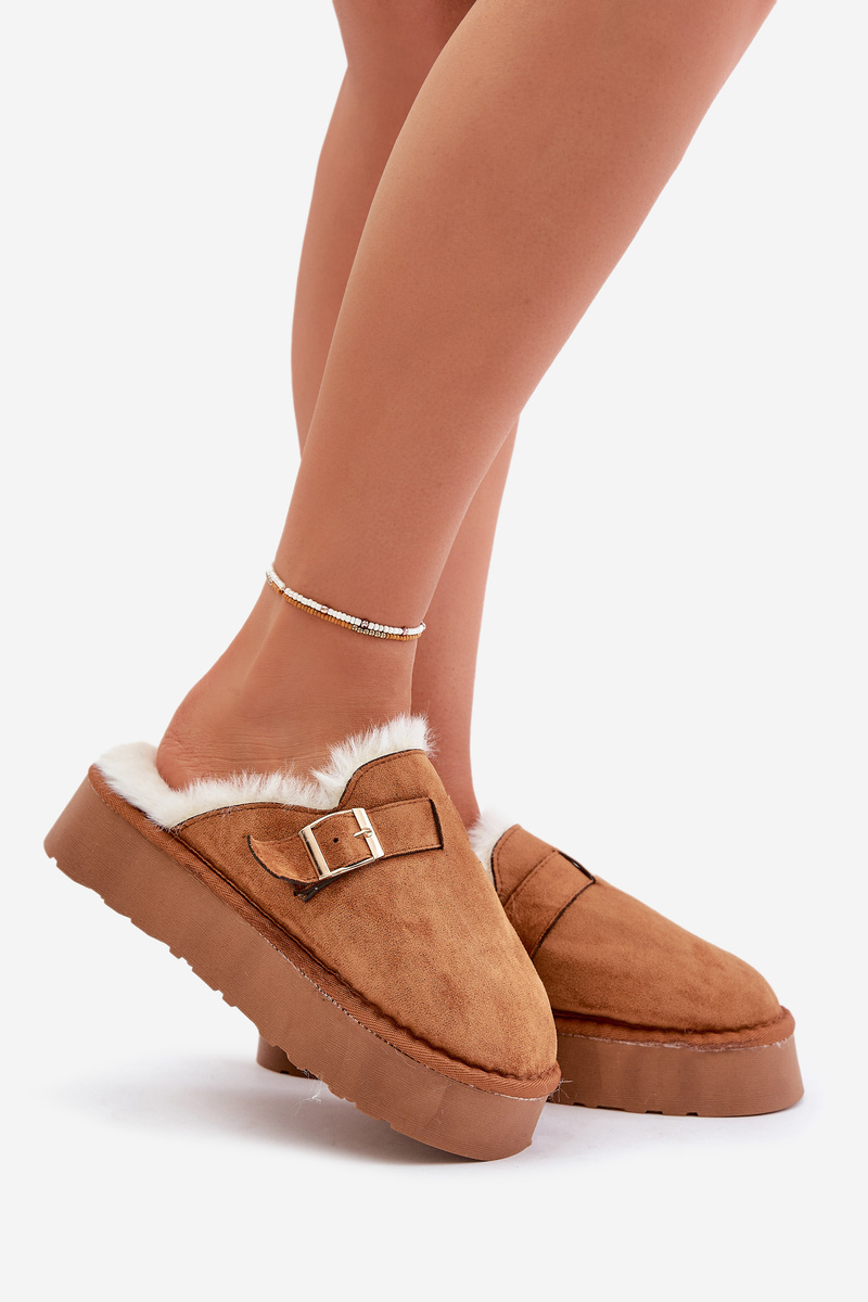 Kapcie Damskie Na Grubej Podeszwie Z Futerkiem I Klamrą Camel Linneola