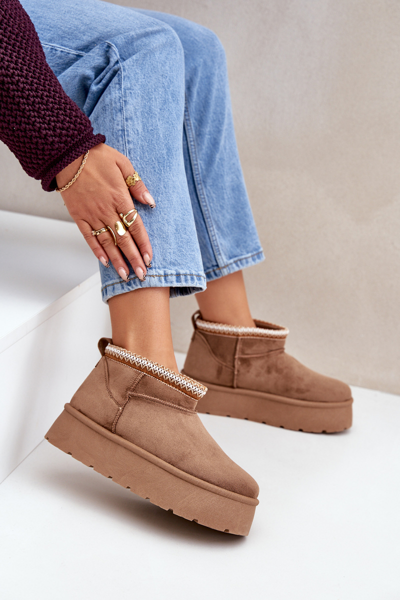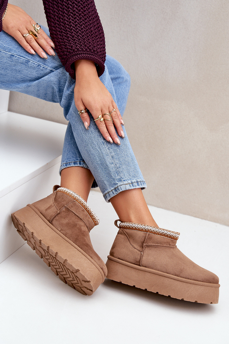 Stylowe śniegowce damskie wykonane z eko zamszu. Osadzone na platformie, która skutecznie izoluje od zimnego podłoża. Wnętrze butów ocieplane miękkim futerkiem, zapewniającym ciepło i komfort w mroźne dni. Górę cholewki zdobi subtelny haft, dodający wyjątkowego uroku. Idealny wybór na zimowe spacery i codzienne aktywności w chłodne dni! Przy wyborze rozmiaru prosimy kierować tabelą rozmiarów.