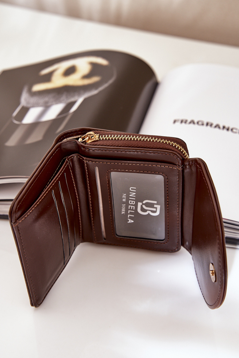 Elegancki portfel damski wykonany z ekologicznej skóry. Model ten posiada kieszeń na monety, którą zamyka suwak. W środku znajduje się sekcja przeznaczona na banknoty oraz karty. Portfel posiada zapięcie na magnes. Klasyczny design z pewnością spodoba się każdej kobiecie!