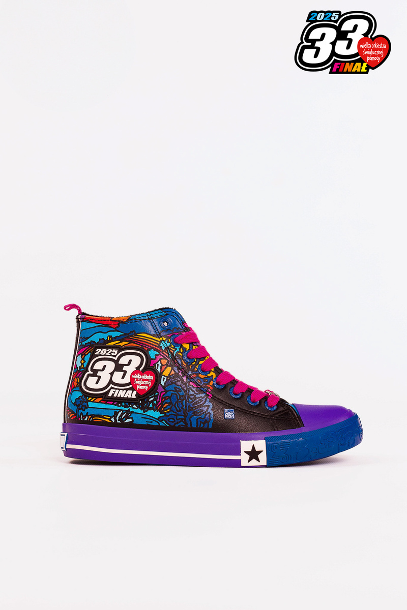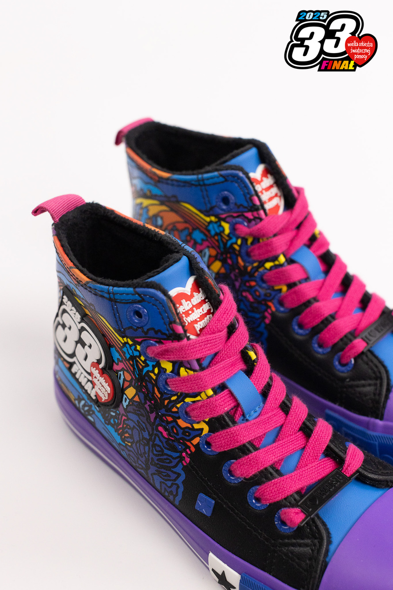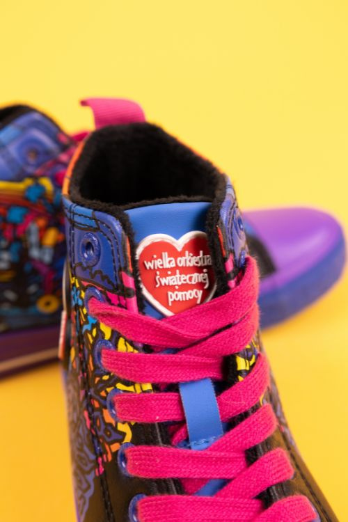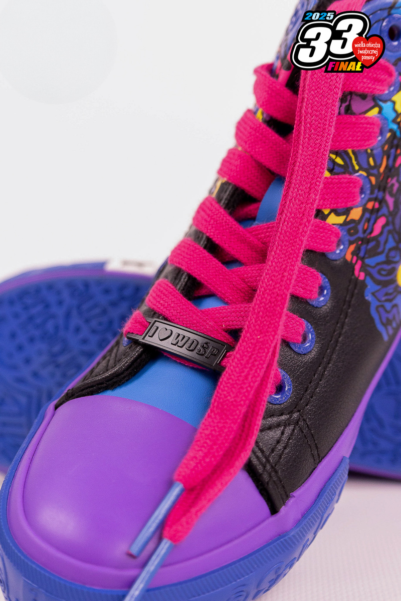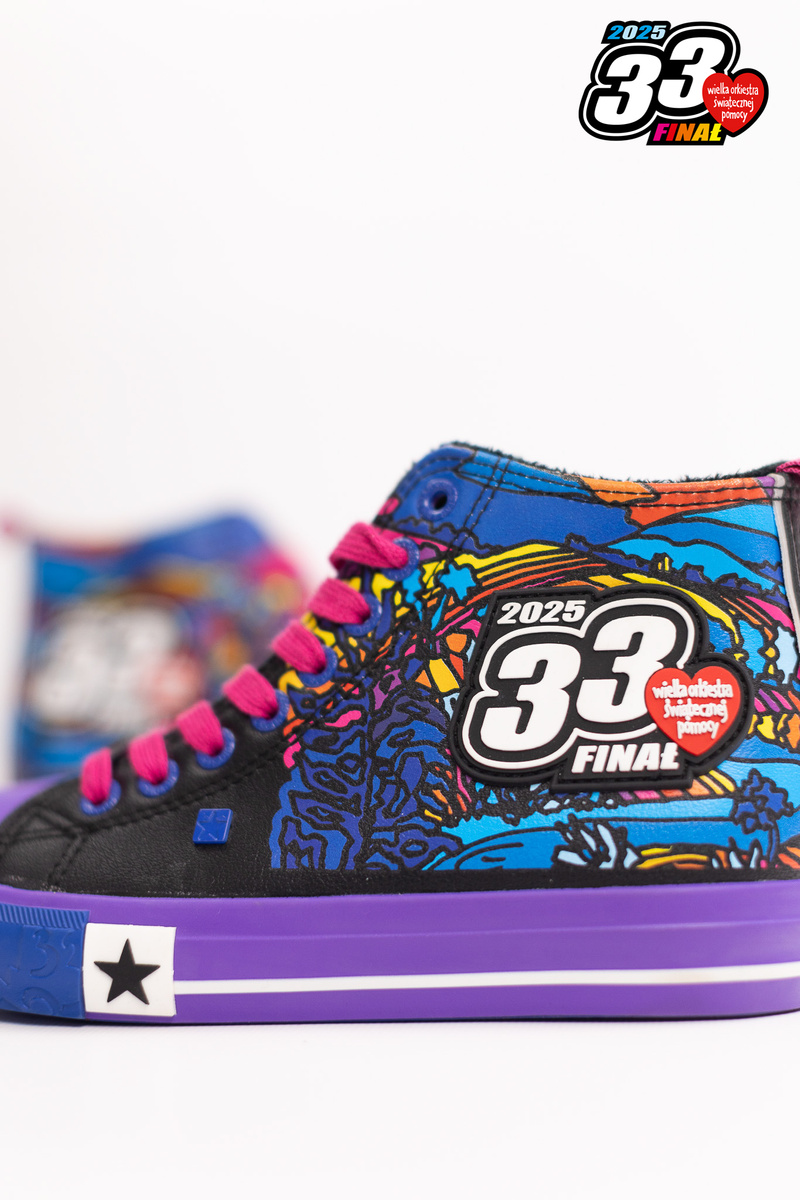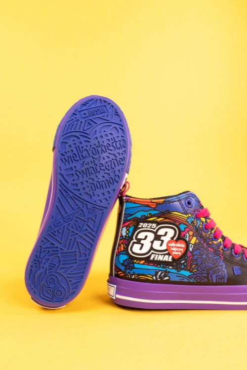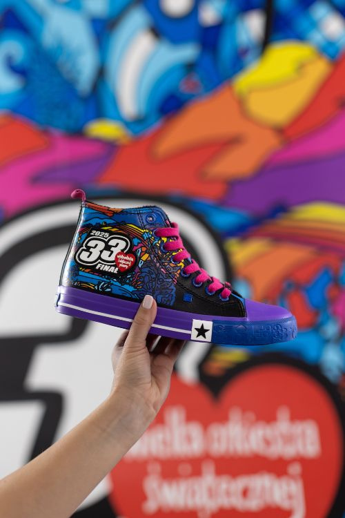 To najbardziej kolorowy i wyrazisty model z całej kolekcji, który został zaprojektowany przez zespół grafików Jurka Owsiaka. Trampki doskonale oddają radosnego ducha akcji WOŚP. Różowe sznurowadła w połączeniu z fioletowo niebieskimi podeszwami sprawiają, że buty odznaczają się niepowtarzanym, energetycznym wyglądem. Przód buta jest ozdobiony charakterystycznym sercem Wielkiej Orkiestry Świątecznej Pomocy, a zewnętrzna strona – dużym logo 33. Finału WOŚP.Wygoda